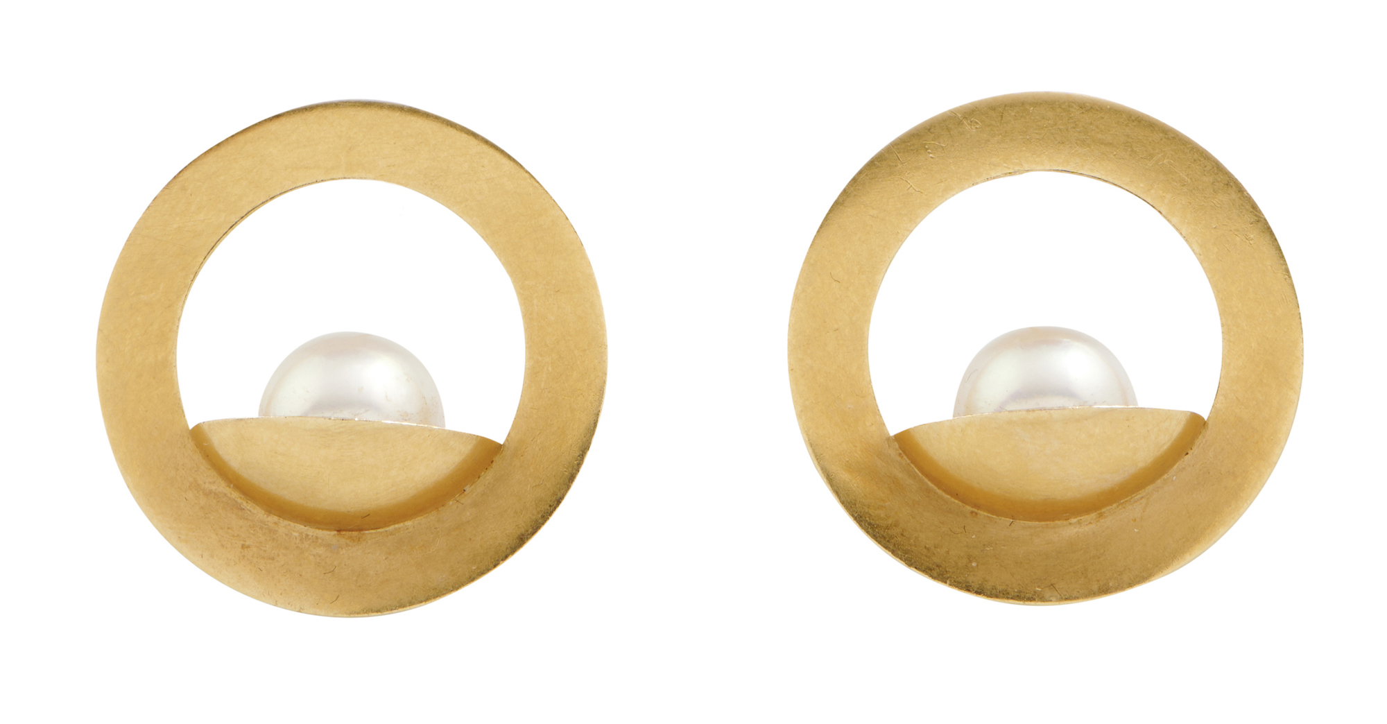 Each earring comprising a cultured pearl of cream hues measuring approximately 8.1mm, within an open circular surround, to post and butterfly fittings, diameter approximately 21mm.