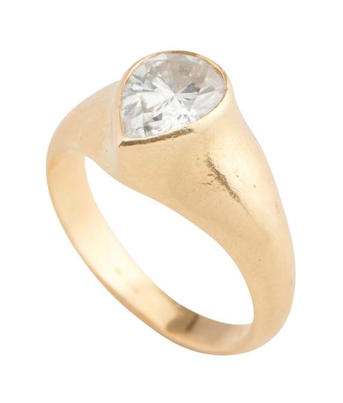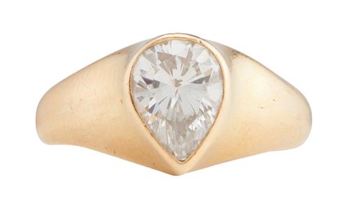 Bezel-set with a pear-cut diamond weighing approximately 1.00 carat, size H.
