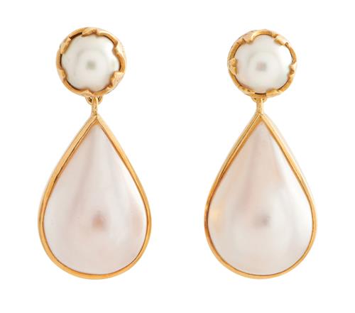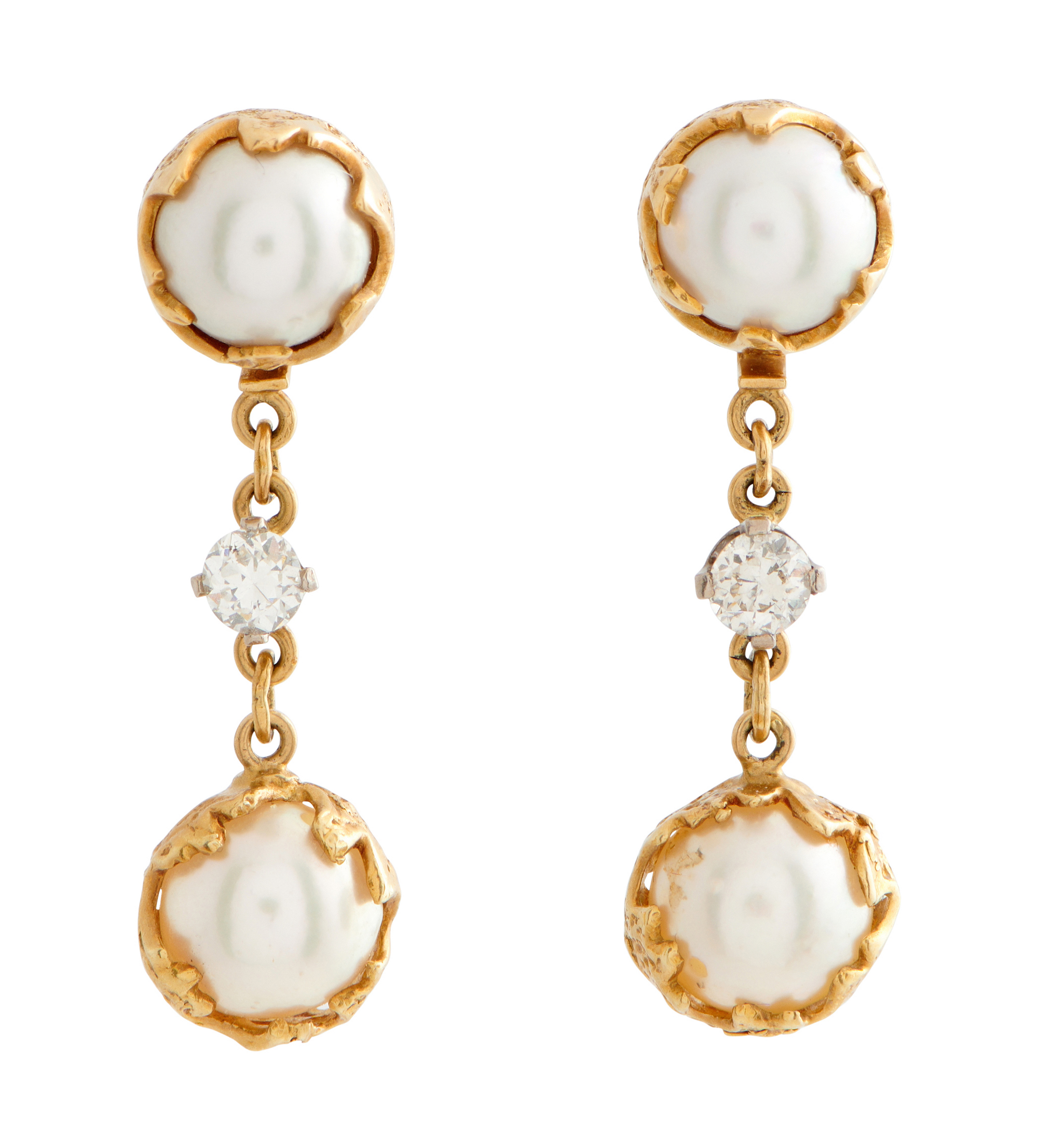 Each earring comprising a cultured pearl surmount within a textured setting, suspending a detachable chain drop set with a single claw-set brilliant-cut diamond weighing approximately 0.25 carats and terminating in a second pearl, length approximately 37mm, with interchangeable pear shaped mabé pearl drop, length approximately 40mm, and diamond set connectors.