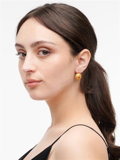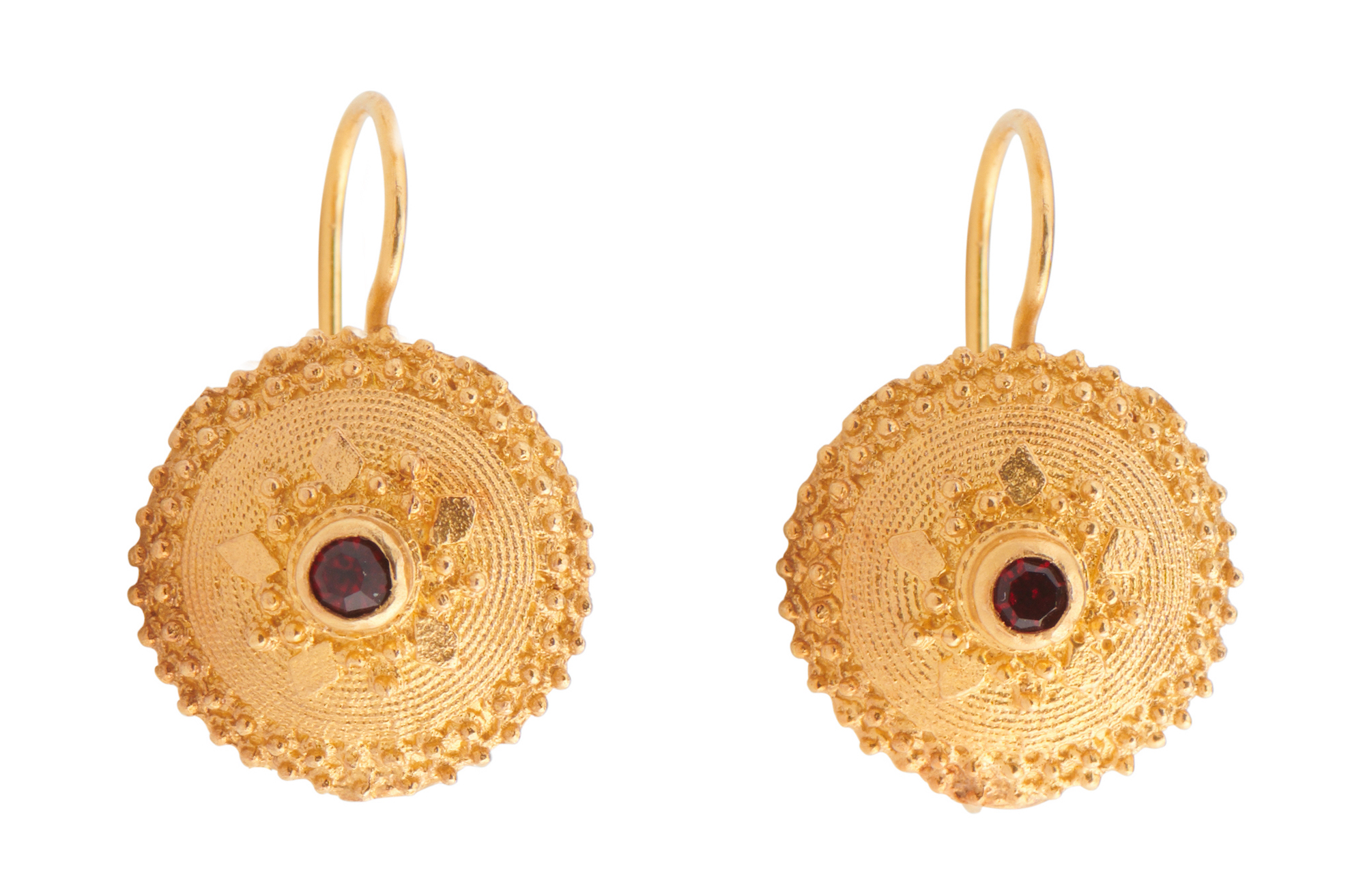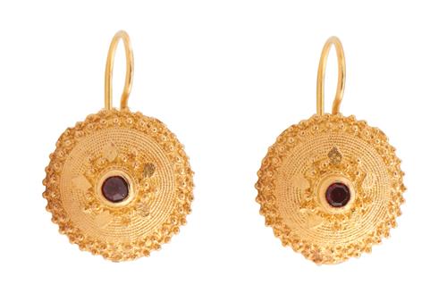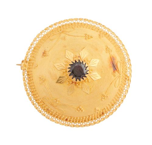 Comprising a brooch centring a circular-cut garnet, within a surround of textured gold and applied with filigree decoration, diameter approximately 40mm; the earrings ensuite, each centring a circular-cut garnet within a decorative surround, to shepherd hook fittings, length approximately 22mm.