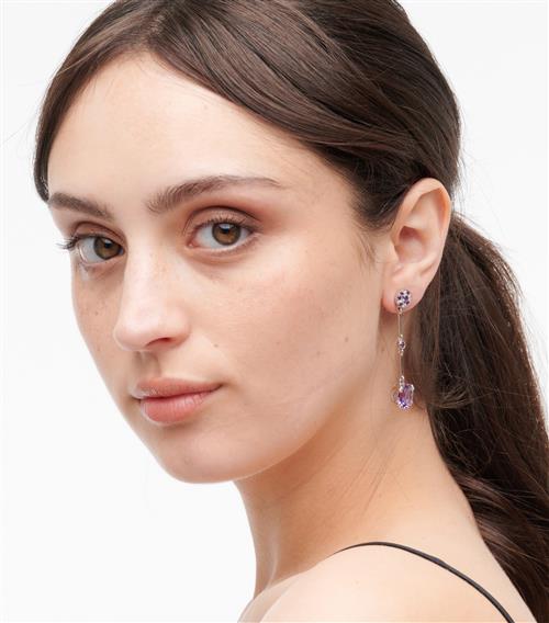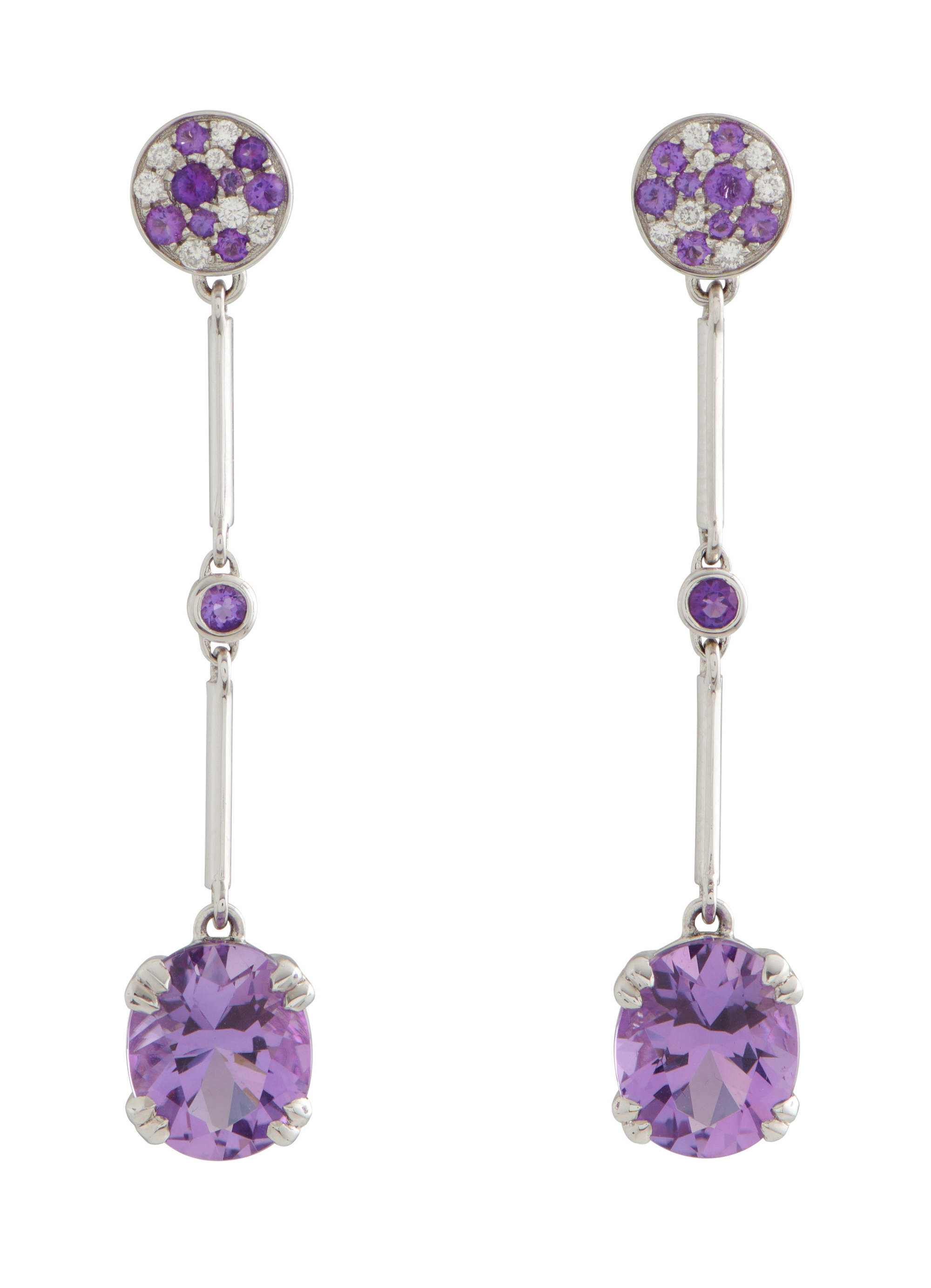 Each earring comprising a claw-set oval-cut amethyst weighing approximately 3.30 carats, suspended below a double knife edge drop centring a single bezel-set amethyst, to a circular pavé set diamond and amethyst surmount, to post and butterfly fittings, signed Mauboussin and numbered AM7979, length approximately 56mm, accompanied by a Mauboussin box.