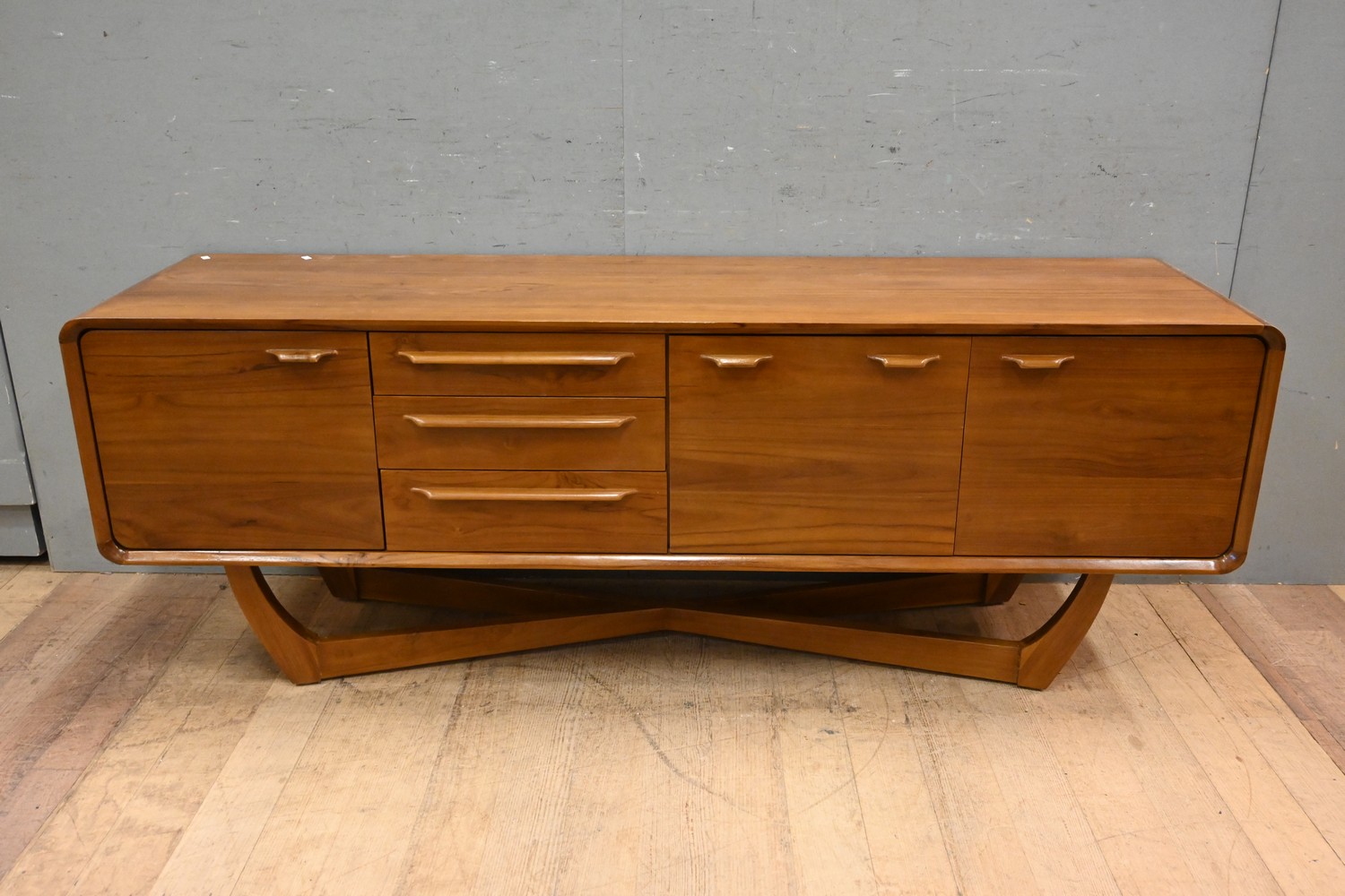 A SLED BASE MID CENTURY STYLE TEAK SIDEBOARD (66H X 181W X 46D CM) (PLEASE NOTE THIS HEAVY ITEM MUST BE REMOVED BY CLIENTS OR CARRIERS AT THE CUSTOMERS EXPENSE. LEONARD JOEL STAFF CANNOT ASSIST CARRYING THIS ITEM)
