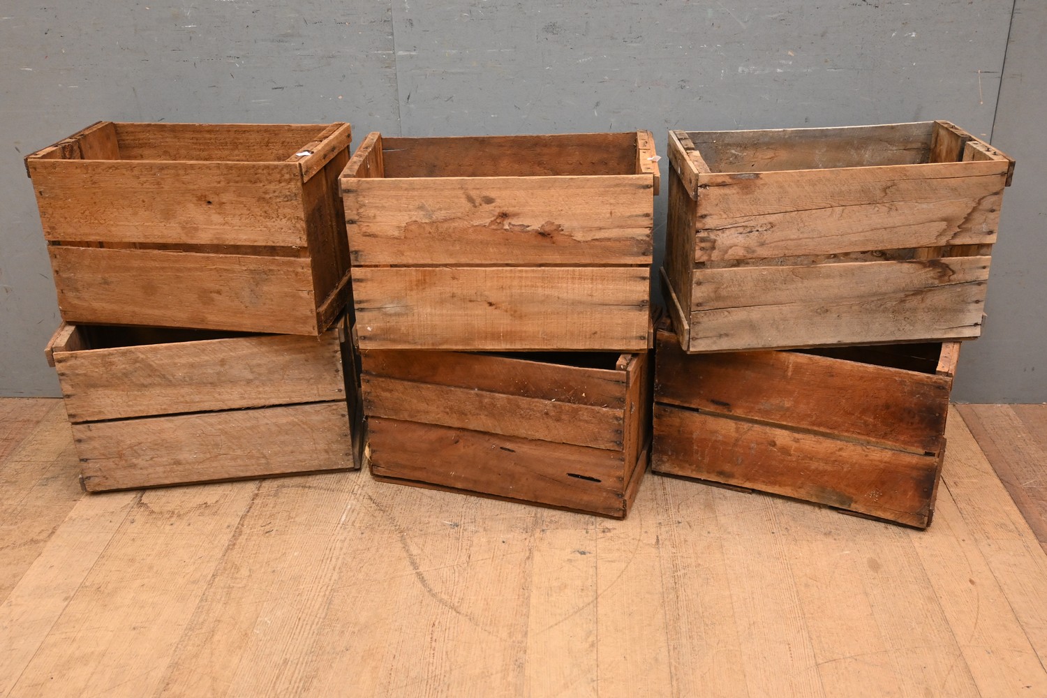 A COLLECTION OF SIX TIMBER CRATES (A/F) (32H X 51W X 28D CM) (LEONARD JOEL DELIVERY SIZE: MEDIUM)