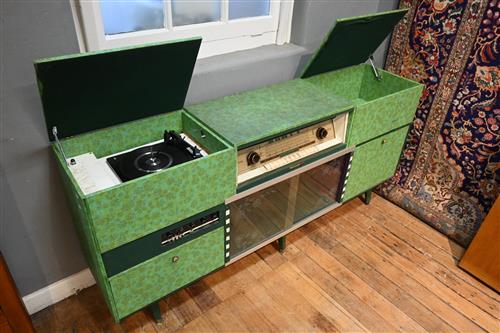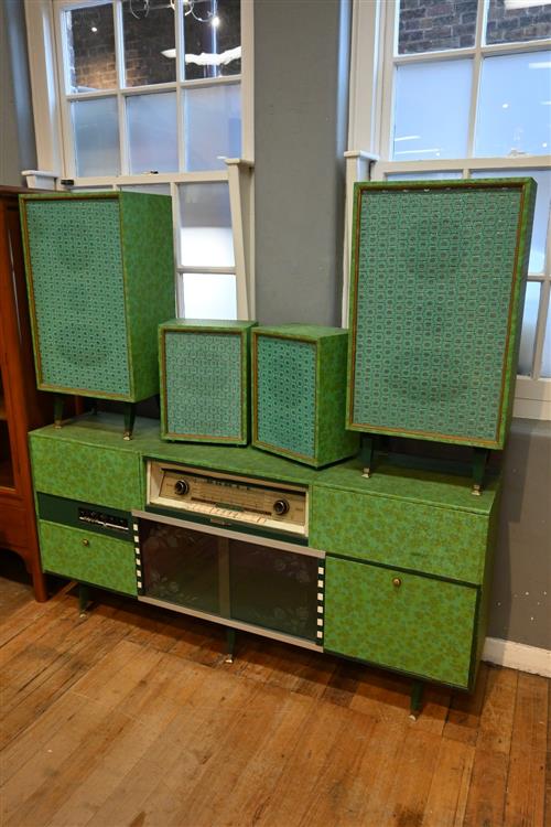 A MID CENTURY SIDEBOARD HIFI CABINET WITH FOUR SPEAKAERS - UNTESTED (A/F) (83H X 183W X 41D CM) (PLEASE NOTE THIS HEAVY ITEM MUST BE REMOVED BY CLIENTS OR CARRIERS AT THE CUSTOMERS EXPENSE. LEONARD JOEL STAFF CANNOT ASSIST CARRYING THIS ITEM)