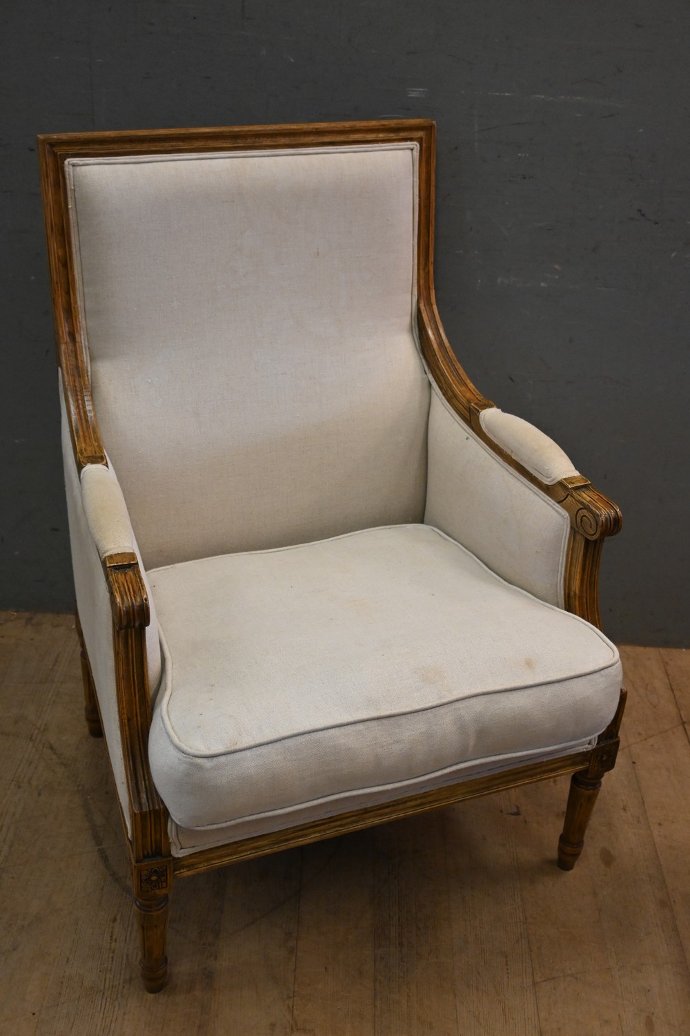 AN UPHOLSTERED ARMCHAIR (A/F) (95H X 65W X 69D CM) (LEONARD JOEL DELIVERY SIZE: LARGE)