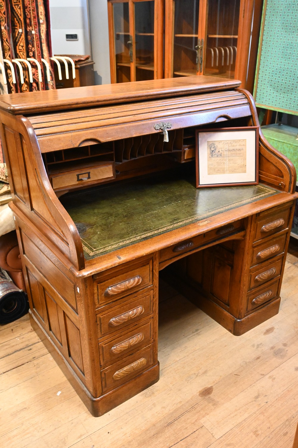 A LATE 19TH CENTURY OAK ROLL TOP DESK (A/F) (128H X 127W X 81D CM) (PLEASE NOTE THIS HEAVY ITEM MUST BE REMOVED BY CLIENTS OR CARRIERS AT THE CUSTOMERS EXPENSE. LEONARD JOEL STAFF CANNOT ASSIST CARRYING THIS ITEM)