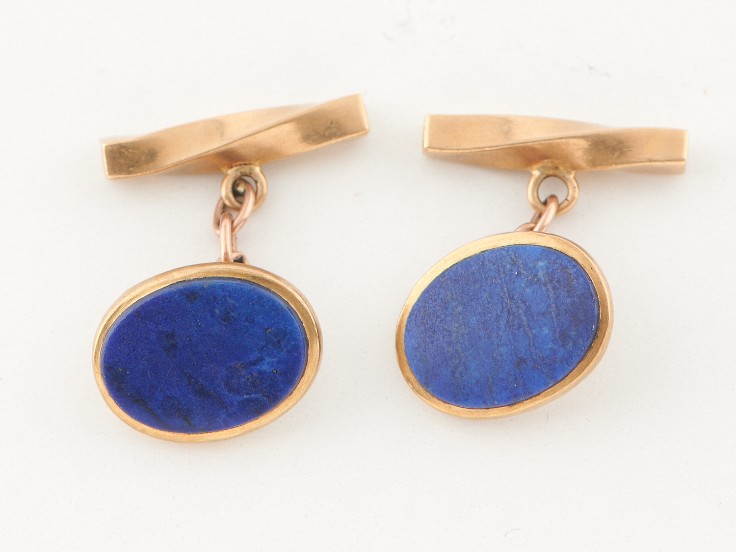 A PAIR OF LAPIS LAZULI CUFFLINKS IN 9CT GOLD, LONDON HALLMARKS, APPROXIMATE SIZE 12 X 16MM, APPROXIMATE WEIGHT 9.4GMS