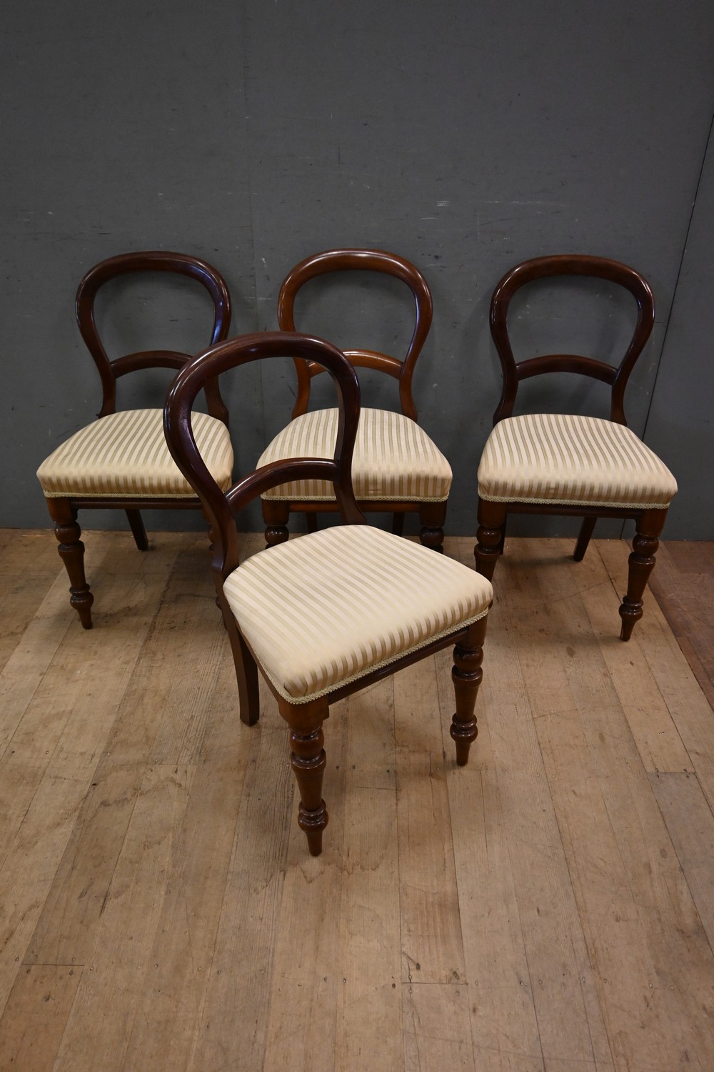 A SET OF FOUR VICTORIAN CEDAR BALLOON BACK DINING CHAIRS (A/F) (87H X 48W X 52D CM) (LEONARD JOEL DELIVERY SIZE: LARGE)