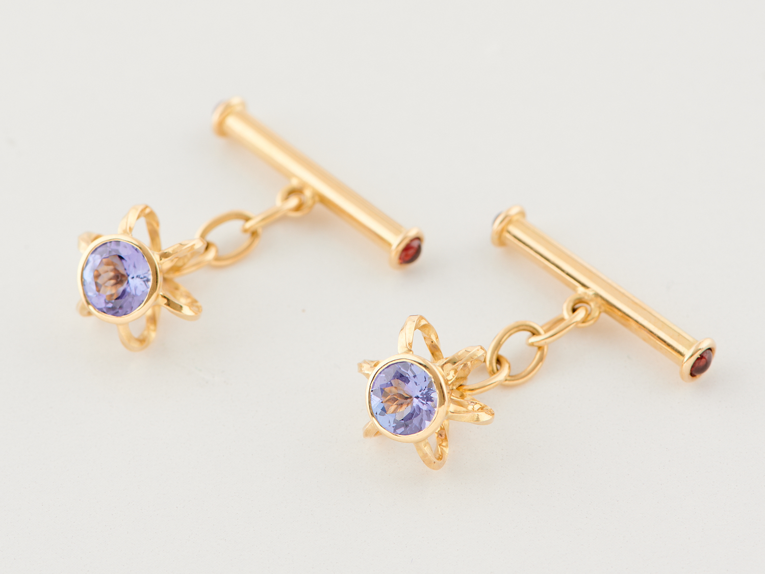 A PAIR OF TANZANITE AND GARNET CUFFLINKS IN 18CT GOLD, 8.7GMS