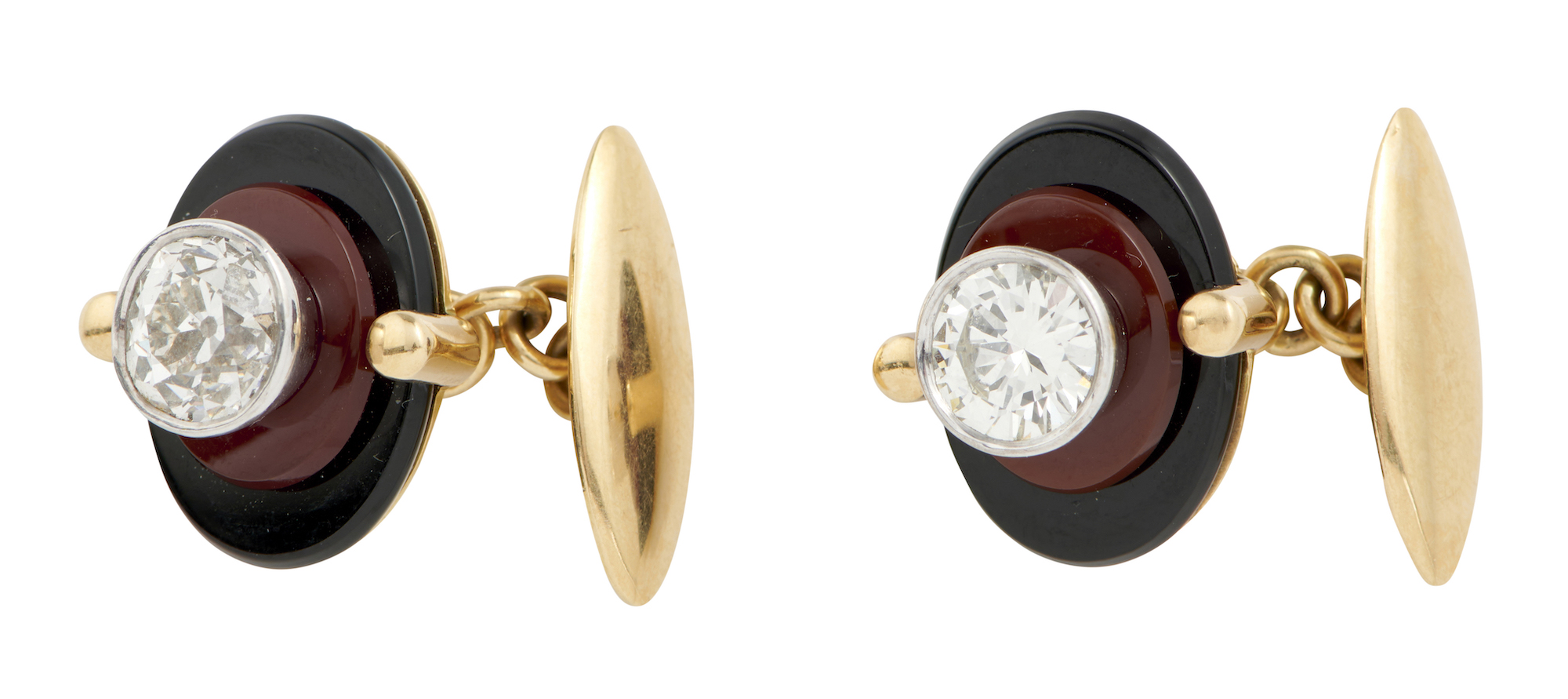 Each cufflink comprising an oval plaque of carnelian on onyx, one centring a bezel-set brilliant-cut diamond weighing approximately 1.50 carats, the other a bezel-set old European-cut diamond weighing approximately 1.20 carats, with chain connectors, each plaque measuring approximately 18mm x 15mm.