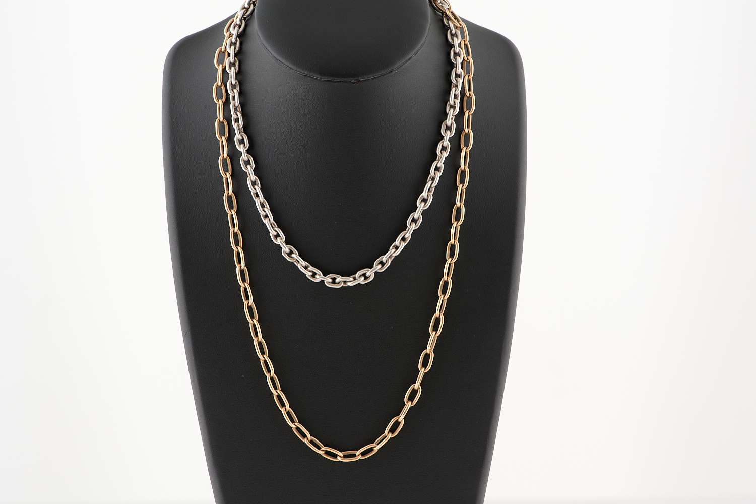 A PAPERCLIP LINK CHAIN TO A LOBSTER CLASP IN 9CT GOLD, LENGTH 590MM, 40.6GMS, TOGETHER WITH A CHAIN IN STERLING SILVER TO A HOOK CLASP, LENGTH 440MM, 50.0GMS