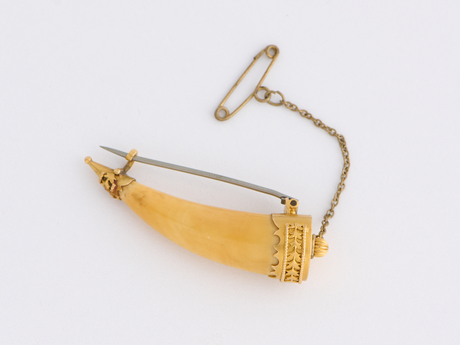 A HORN OF PLENTY BROOCH IN 15CT GOLD, PIN AND SAFETY CHAIN IN BASE METAL, LENGTH 55MM, 7.3GMS