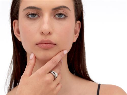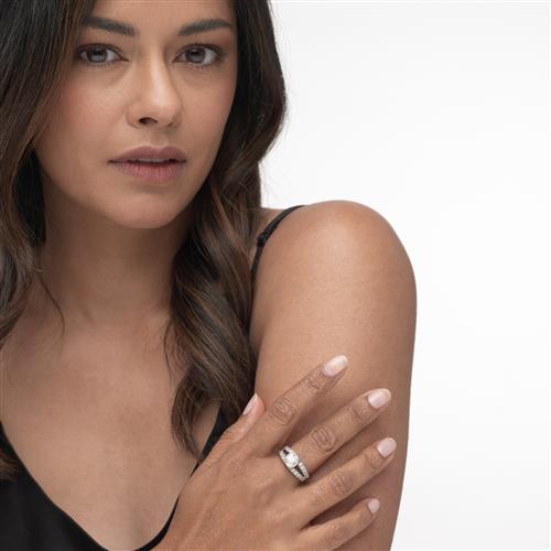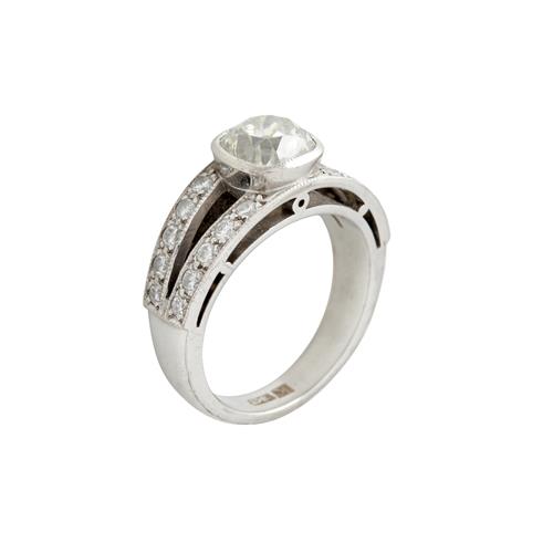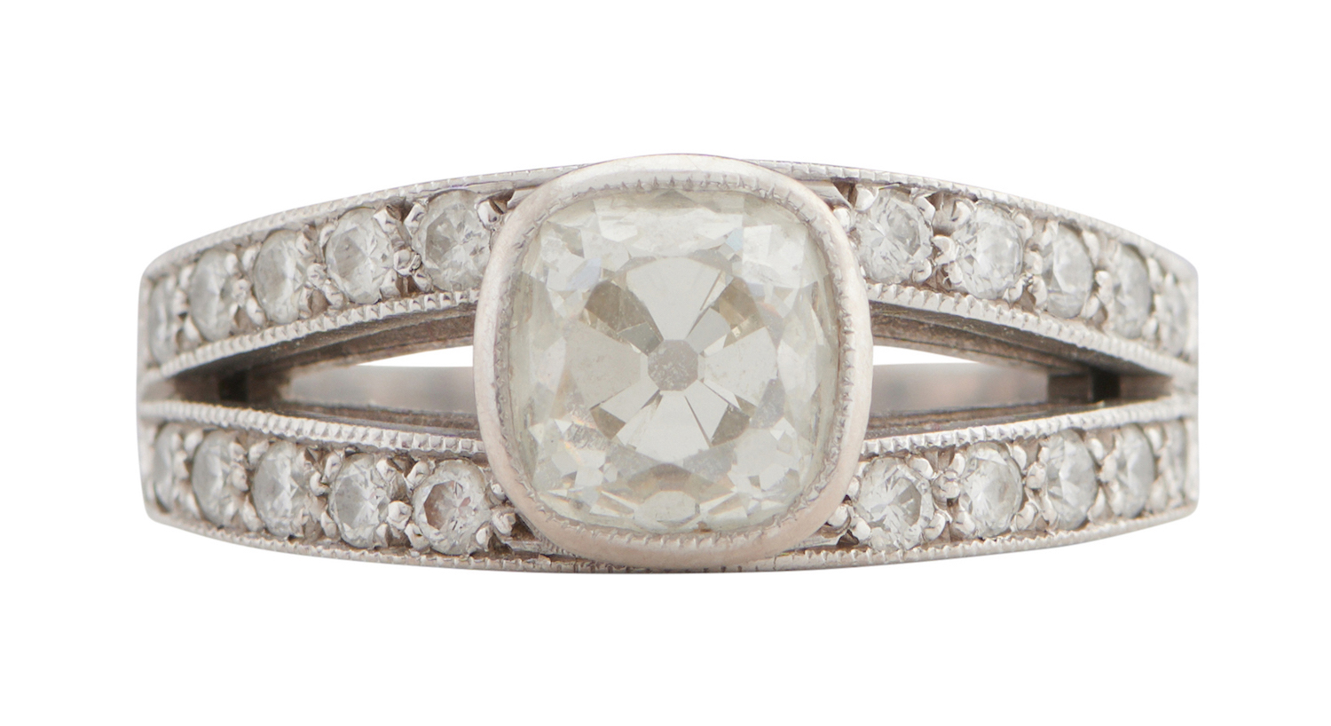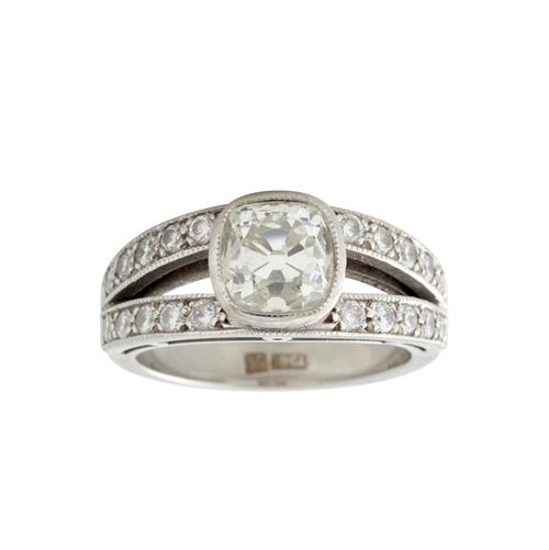 Centring a collet-set old cushion-cut diamond weighing 2.18 carats, to a split band set with brilliant-cut diamonds together weighing approximately 0.62 carats, stamped K for Kozminsky, size P.