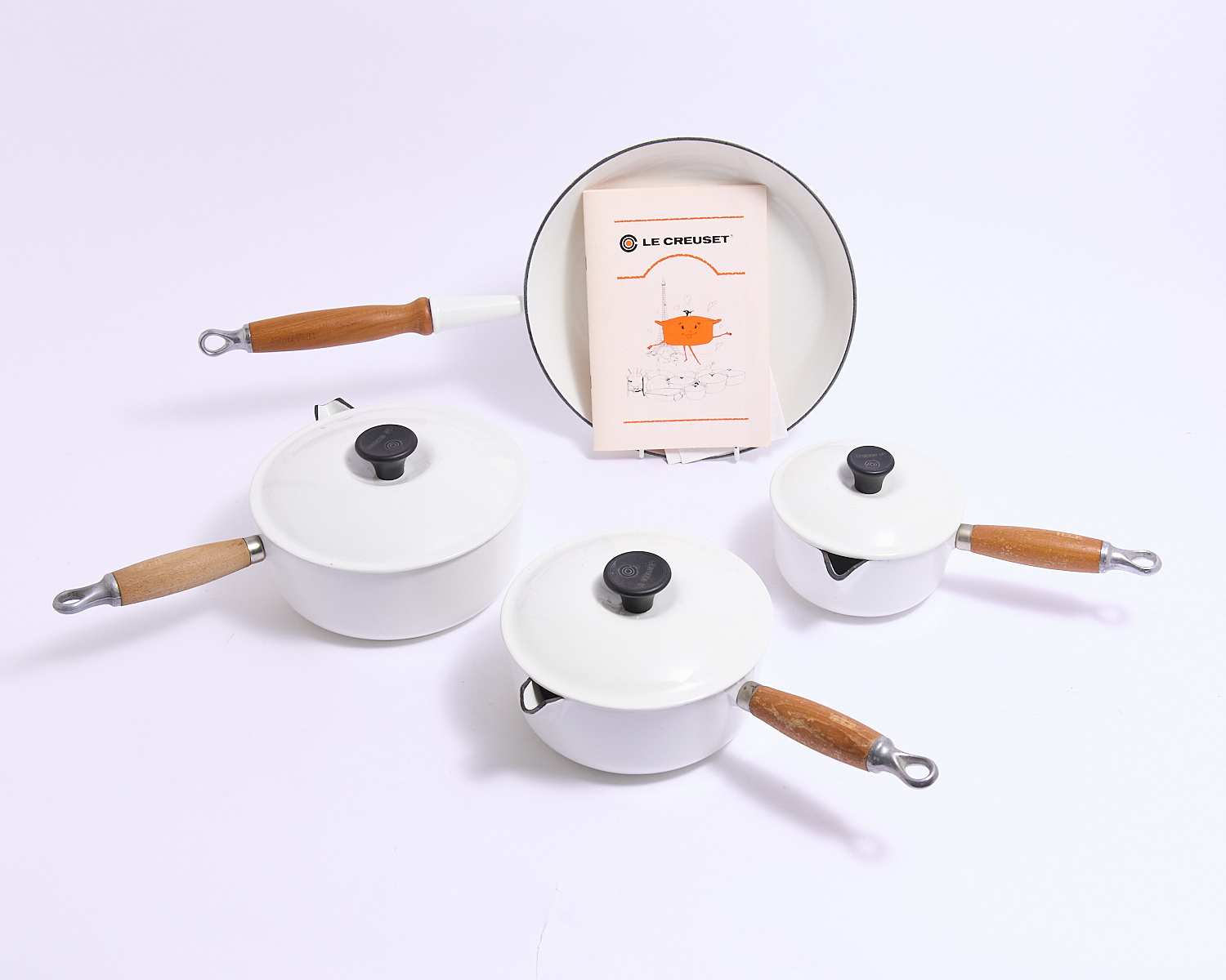 A SET OF FOUR LE CREUSET PANS WITH WOODEN HANDLES DIA.26.5CM (LARGEST), LEONARD JOEL LOCAL DELIVERY: MEDIUM