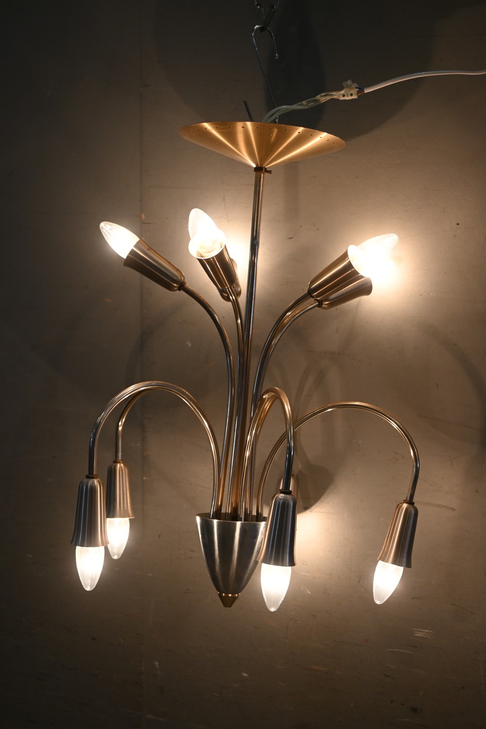 A 1950'S ANODISED TEN BRANCH TULIP ALUMINIUM CHANDELIER (DROP 63 CM, 46 D CM) (LEONARD JOEL DELIVERY SIZE: LARGE)