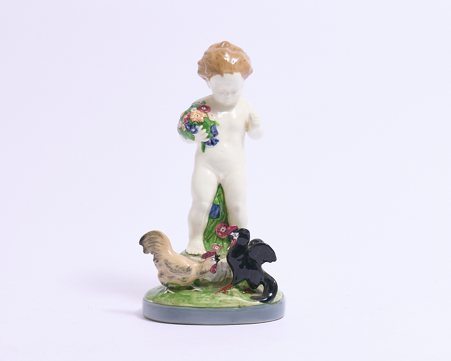 AN AUSTRIAN PORCELAIN FIGURINE OF A PUTTO WITH FIGHTING FOWLS CIRCA 1910 H.24CM (HAIRLINE), LEONARD JOEL LOCAL DELIVERY: SMALL