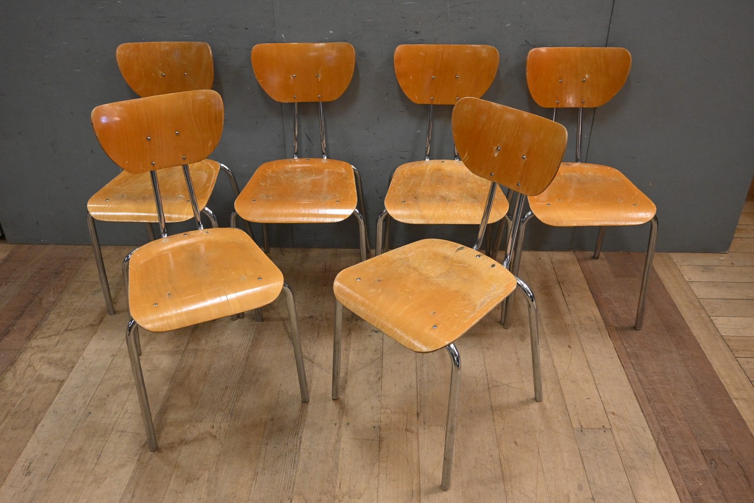 A SET OF SIX DUTCH CHROME AND PLYWOOD DINING CHAIRS (A/F) (81H X 43W X 53D CM) (LEONARD JOEL DELIVERY SIZE: LARGE)