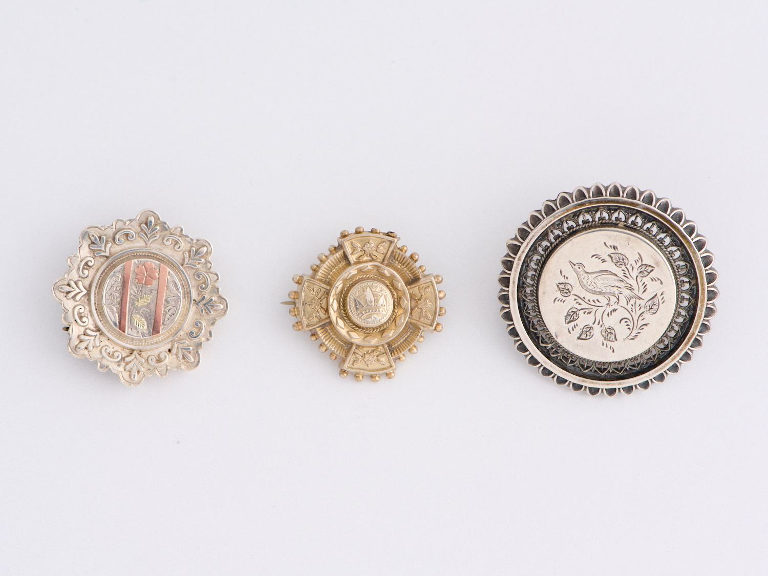 THREE VICTORIAN STERLING SILVER TARGET BROOCHES INCLUDING SILVER GILT & 9CT DETAIL