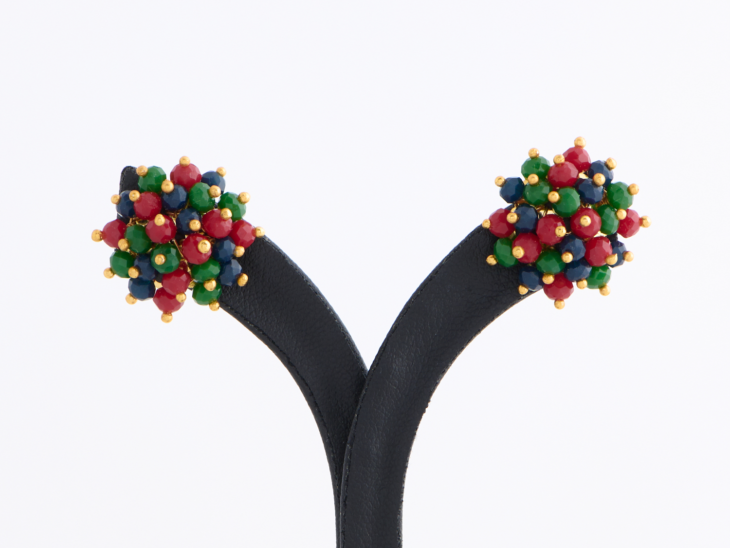 A PAIR OF VINTAGE EMERALD RUBY AND SAPPHIRE CLUSTER EARRINGS TO POST AND BUTTERFLY FITTINGS IN SILVER GILT, DIAMETER 20MM