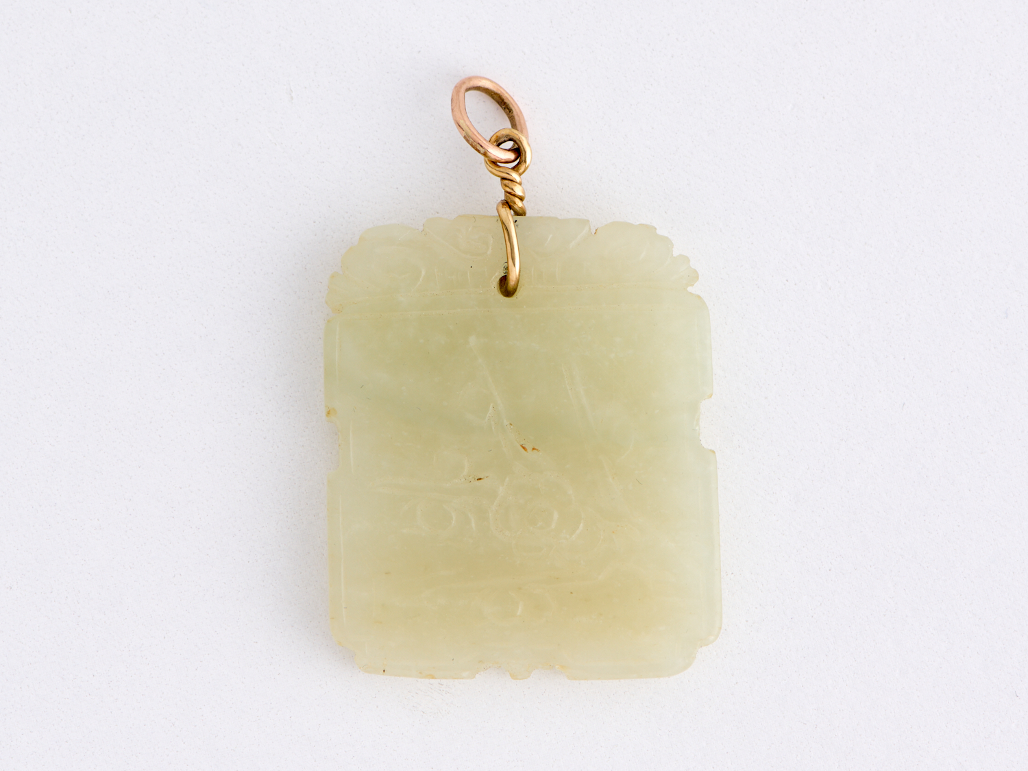 AN ANTIQUE JADE PLAQUE PENDANT WITH 9CT GOLD BALE, 35MM X 30MM
