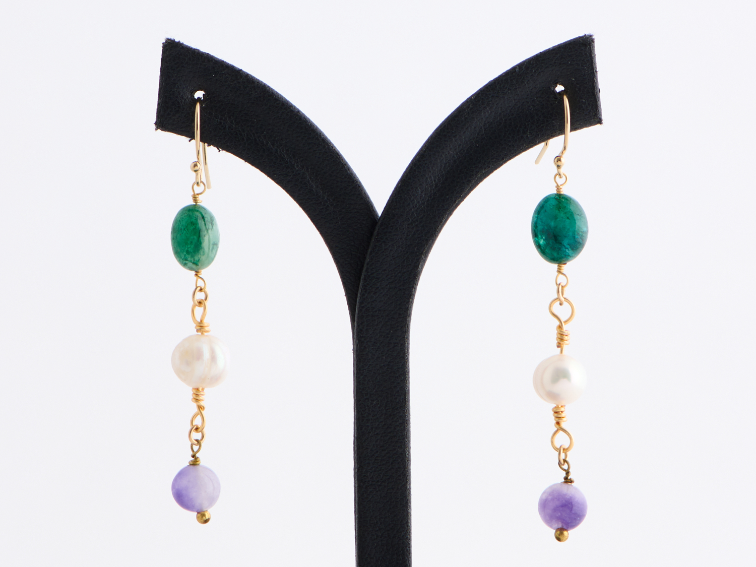 A PAIR OF BAROQUE PEARL, EMERALD AND AMETHYST DROP EARRINGS TO 14CT GOLD FILLED SHEPHERDS HOOKS, DROP LENGTH 60MM