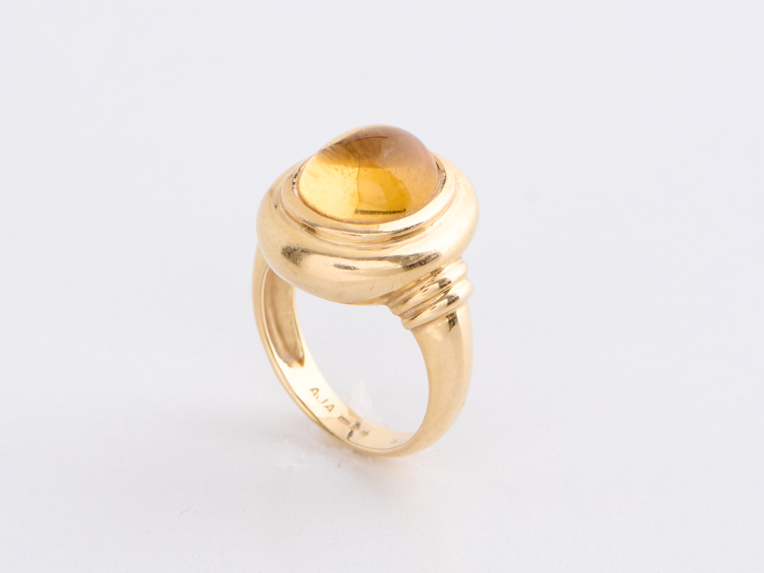 A CITRINE RING IN 14CT GOLD, THE CITRINE CUT EN CABOCHON WEIGHING APPROXIMATELY 4.10 CARATS, SIZE N