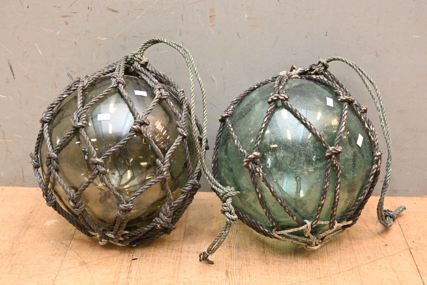 PAIR OF ROPE BOUND GREEN GLASS SHIPS BUOYS / FISHING FLOATS (34 CM D) (LEONARD JOEL DELIVERY SIZE: MEDIUM)