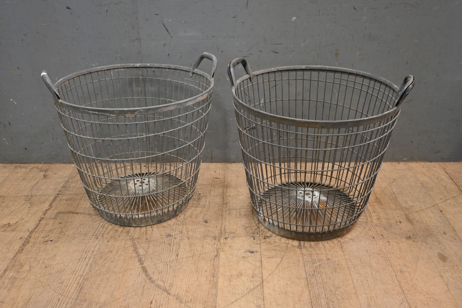 A PAIR OF FRENCH GALVONISED 2 HANDLED METAL FRUIT BASKETS (45H X 49D CM) (LEONARD JOEL DELIVERY SIZE: MEDIUM)