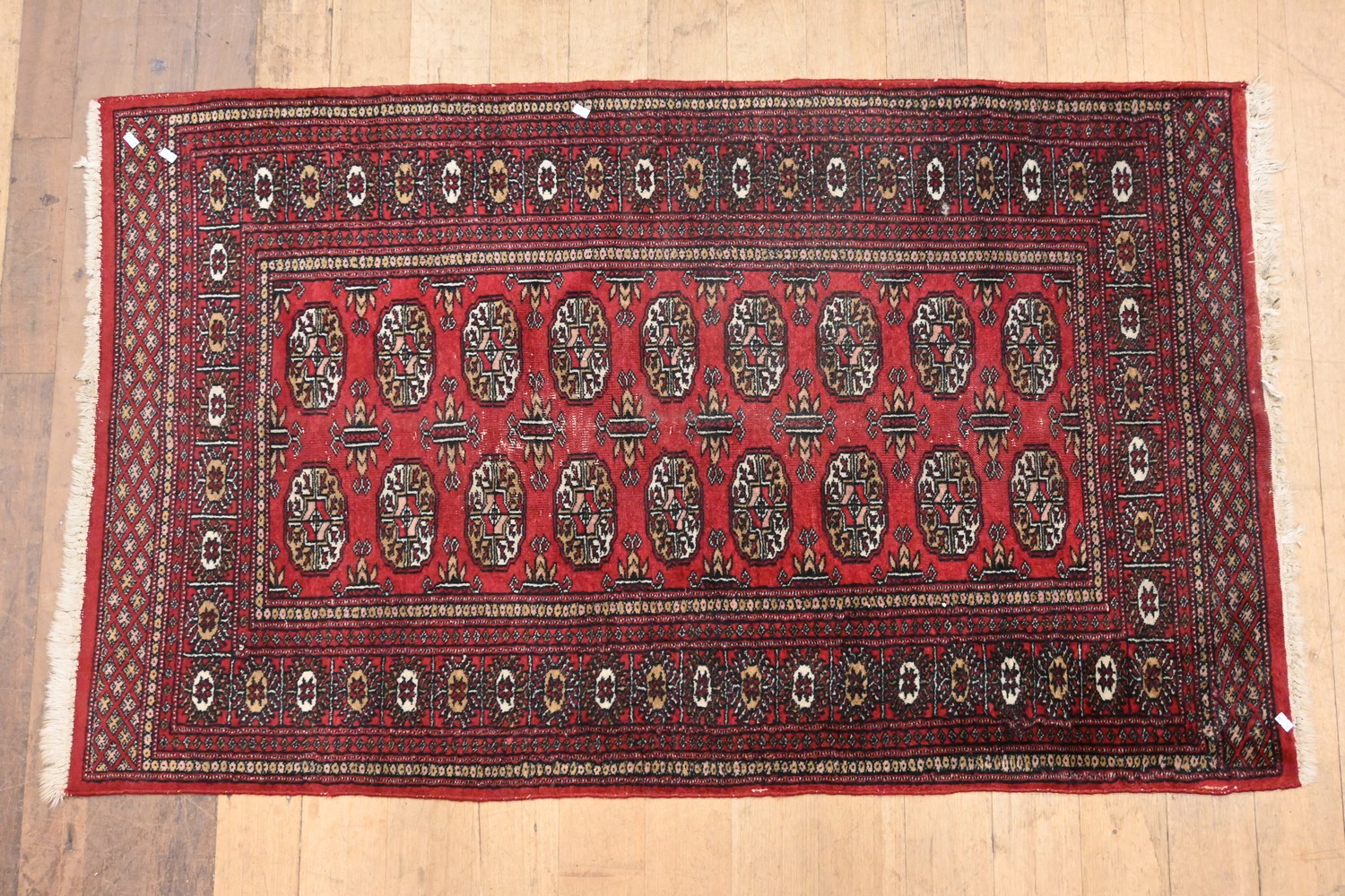A PERSIAN PURE WOOLEN RED TONED RUG (A/F) (160 X 92 CM) (LEONARD JOEL DELIVERY SIZE: SMALL)