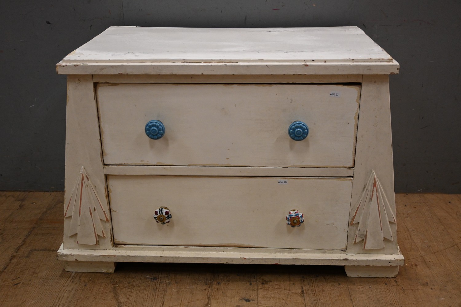 AN ART DECO TAPERED FORM PAINTED WHITE WOODEN 2 DRAWER CABINET (A/F) (54H X 83W X 41D CM) (LEONARD JOEL DELIVERY SIZE: LARGE)
