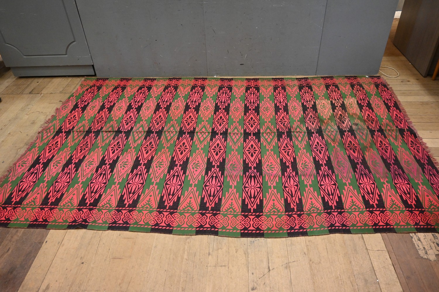 A VINTAGE TRIBAL RUG IN GREEN AND RED TONES (A/F) (310 X 196 CM) (LEONARD JOEL DELIVERY SIZE: MEDIUM)