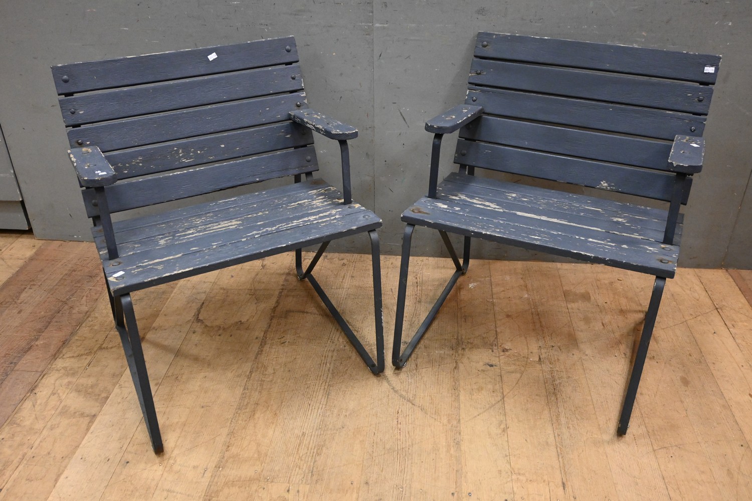 A PAIR OF PAINTED AND SLATTED STEEL FRAMED GARDEN ARMCHAIRS (73H X 62W X 61D CM) (LEONARD JOEL DELIVERY SIZE: LARGE)