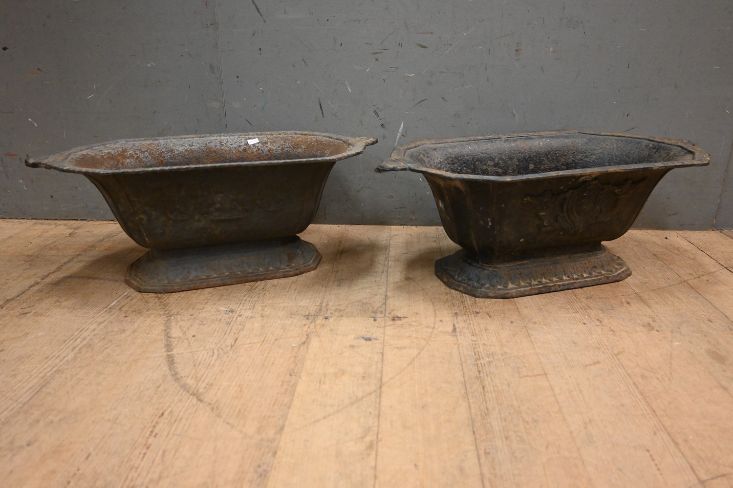 PAIR OF FRENCH CAST IRON PLANTER POTS WITH RAISED FLORAL MOTIF TO SIDE (24H X 62W X 33D CM) (LEONARD JOEL DELIVERY SIZE: LARGE)
