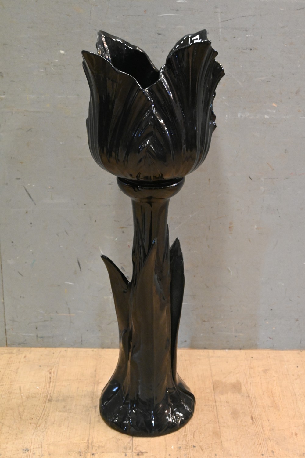 A RETRO BLACK PORCELAIN TULIP DESIGN PLANTER ON PEDESTAL (94H X 33D CM) (LEONARD JOEL DELIVERY SIZE: MEDIUM)