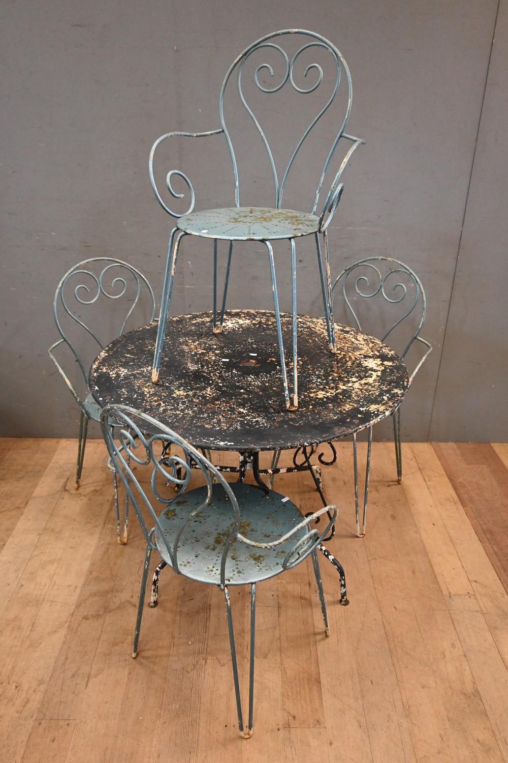 A FRENCH WROUGHT IRON GREEN GARDEN TABLE AND FOUR MATCHED ARM CHAIRS (A/F) (71H X 97D CM) (LEONARD JOEL DELIVERY SIZE: X-LARGE)
