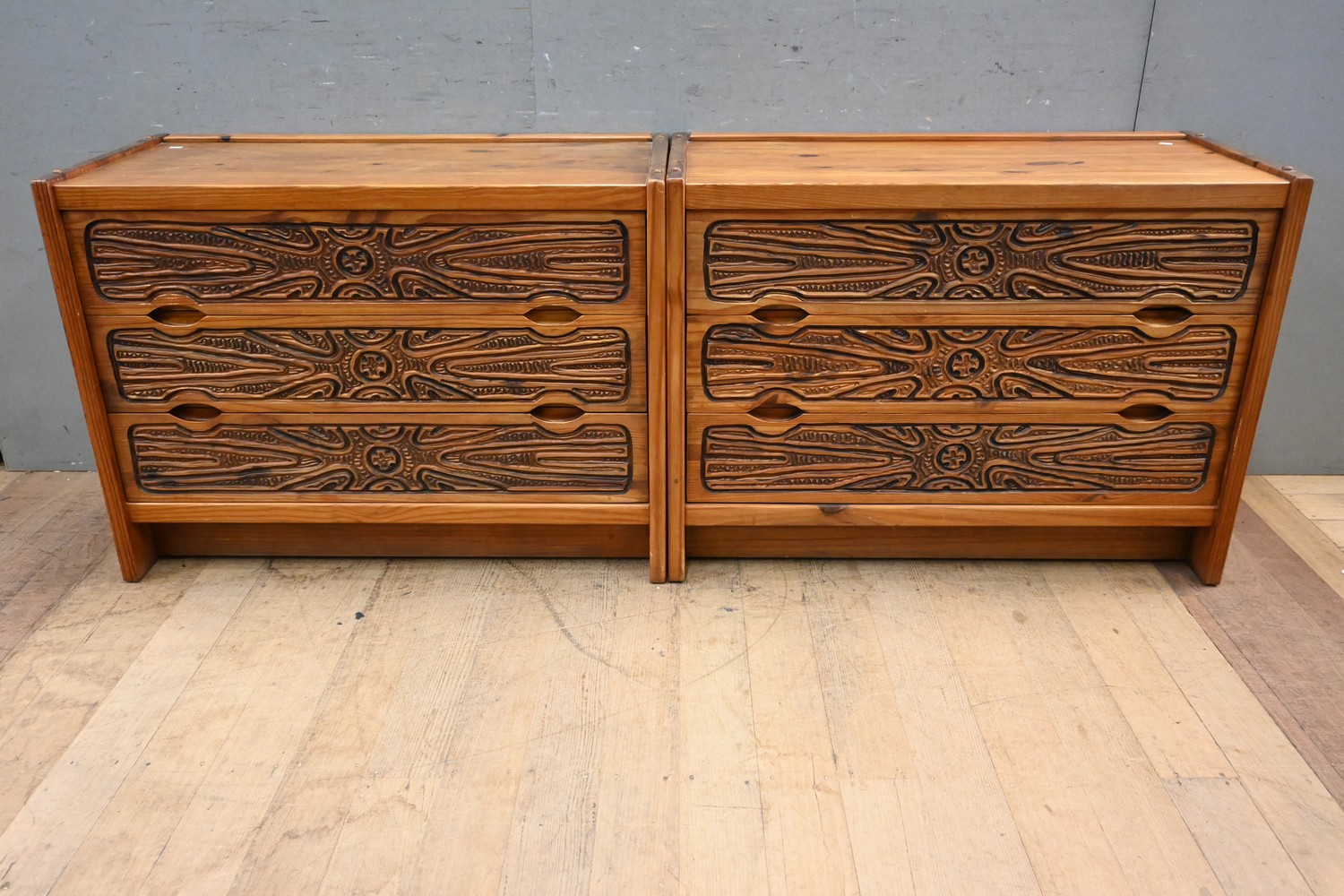 A PAIR OF DECORATIVELY CARVED THREE DRAWER CHESTS (A/F) (71H X 96W X 44D CM)(PLEASE NOTE THIS HEAVY ITEM MUST BE REMOVED BY CLIENTS OR CARRIERS AT THE CUSTOMERS EXPENSE. LEONARD JOEL STAFF CANNOT ASSIST CARRYING THIS ITEM)
