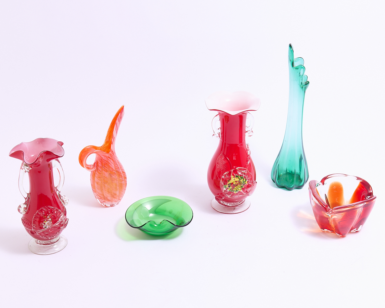 A COLLECTION OF RETRO ART GLASS VASES AND BOWLS, H.32.5CM (TALLEST), LEONARD JOEL LOCAL DELIVERY: MEDIUM