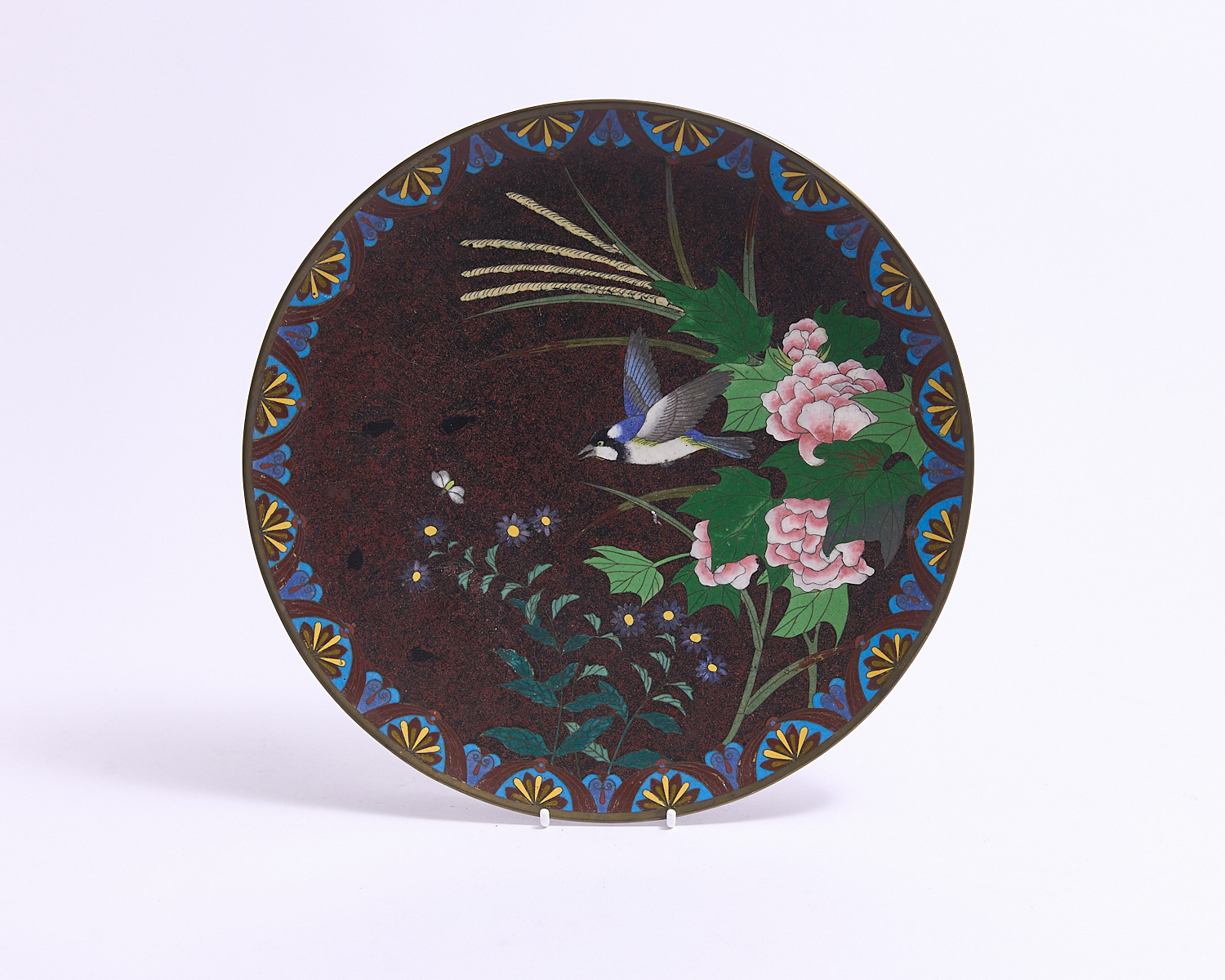 A JAPANESE CLOISONNE PLATE WITH FLORAL BIRD AND BUTTERFLY DESIGN, DIA.30.5CM, LEONARD JOEL LOCAL DELIVERY: SMALL