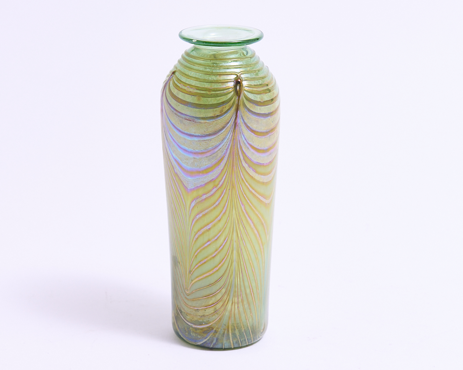 AN IRRIDISED ART GLASS VASE WITH FEATHER PATTERNING, H.17.5CM, LEONARD JOEL LOCAL DELIVERY: SMALL