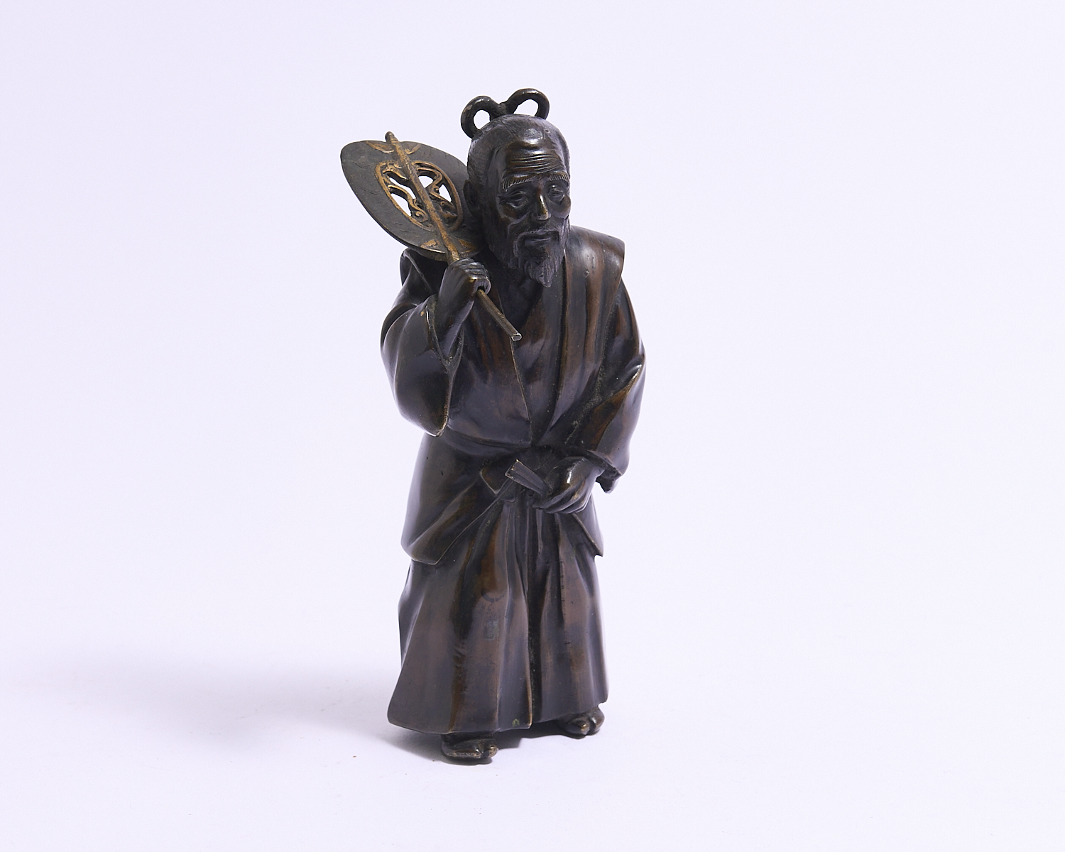 A CHINESE BRONZED METAL FIGURE OF AN IMMORTAL WITH FAN, H.18CM, LEONARD JOEL LOCAL DELIVERY: SMALL