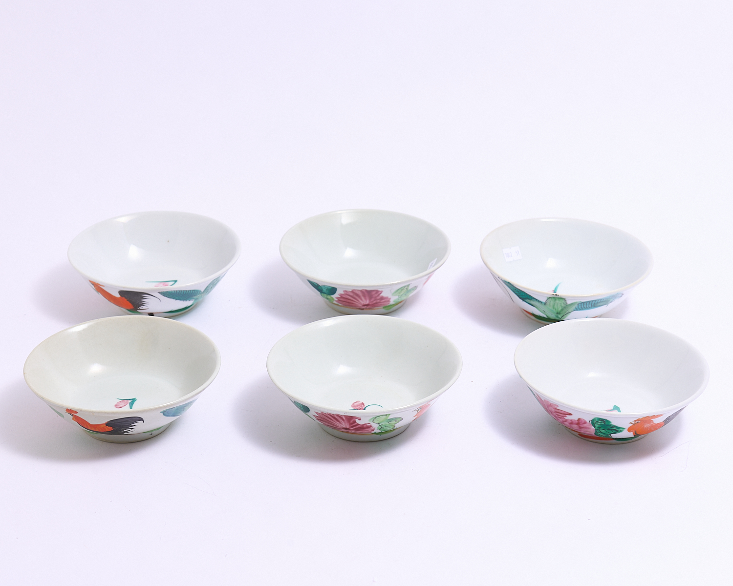 SIX CHINESE HAND PAINTED ROOSTER AND BAT DECORATED BOWLS, DIA.16CM, LEONARD JOEL LOCAL DELIVERY: SMALL