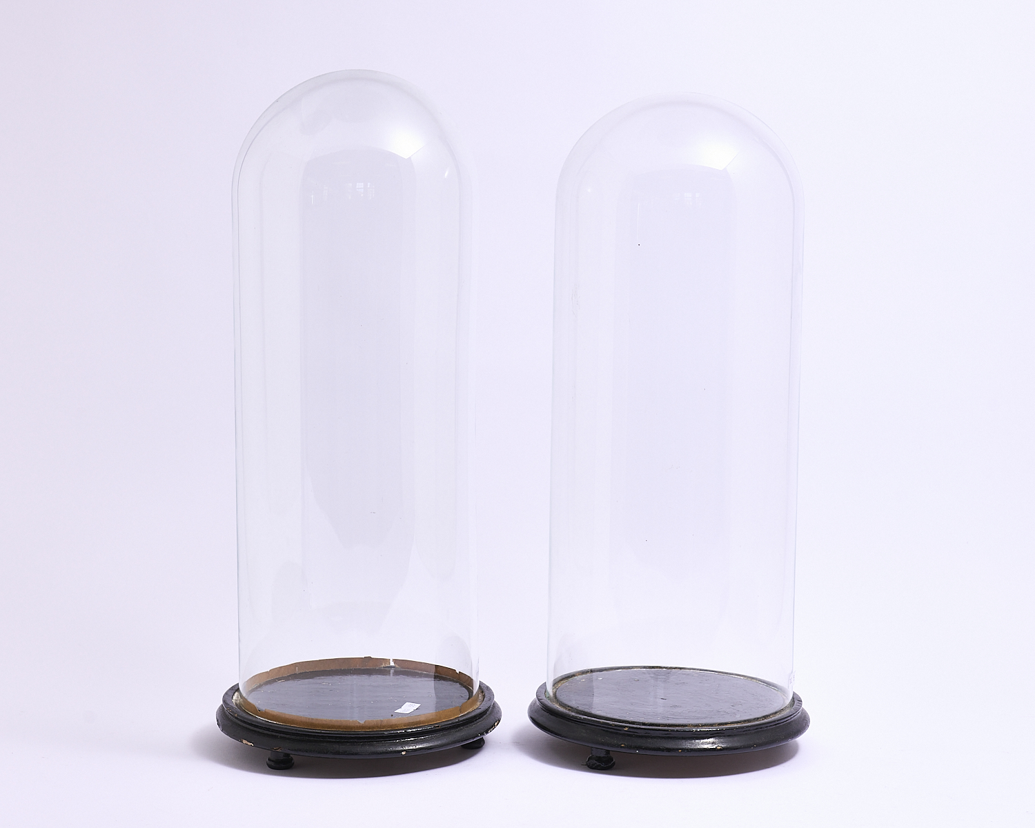 A PAIR OF FRENCH GLASS DOMES ON EBONISED WOODEN BASES, H.54CM, LEONARD JOEL LOCAL DELIVERY: MEDIUM