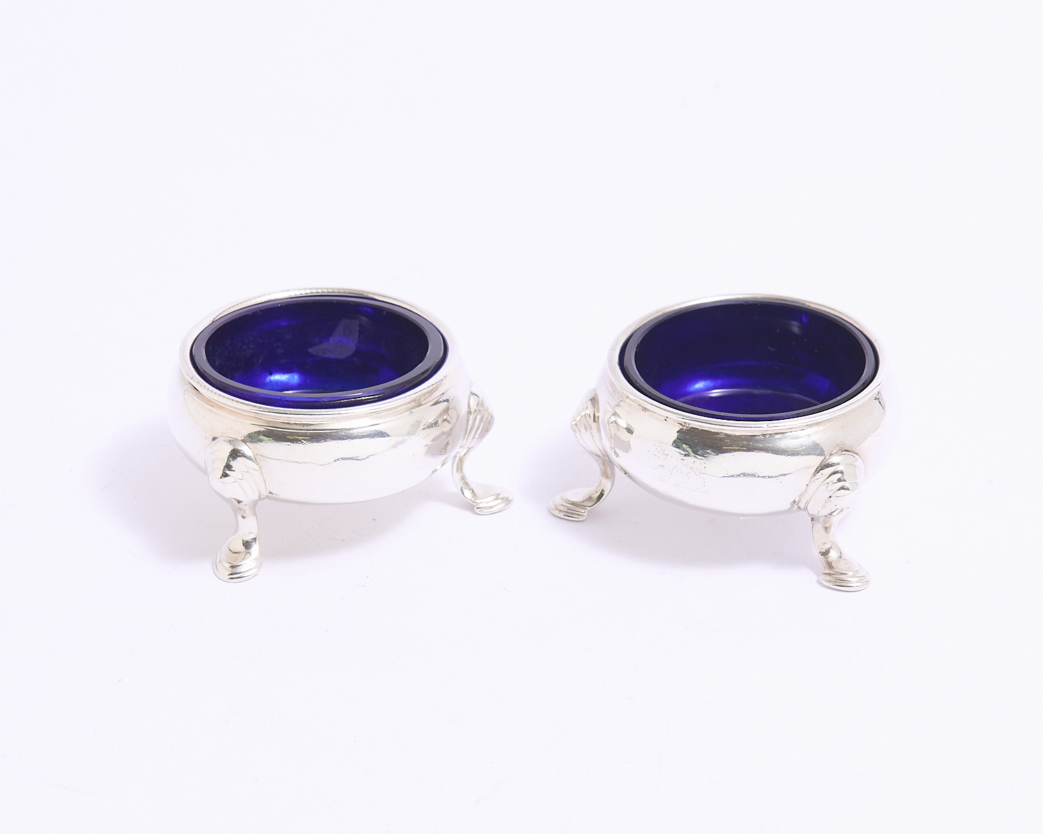 A PAIR OF GEORGIAN STERLING SILVER OPEN SALTS WITH BRISTOL BLUE GLASS LINERS - 138 GRAMS SILVER DIA.6CM, LEONARD JOEL LOCAL DELIVERY: SMALL