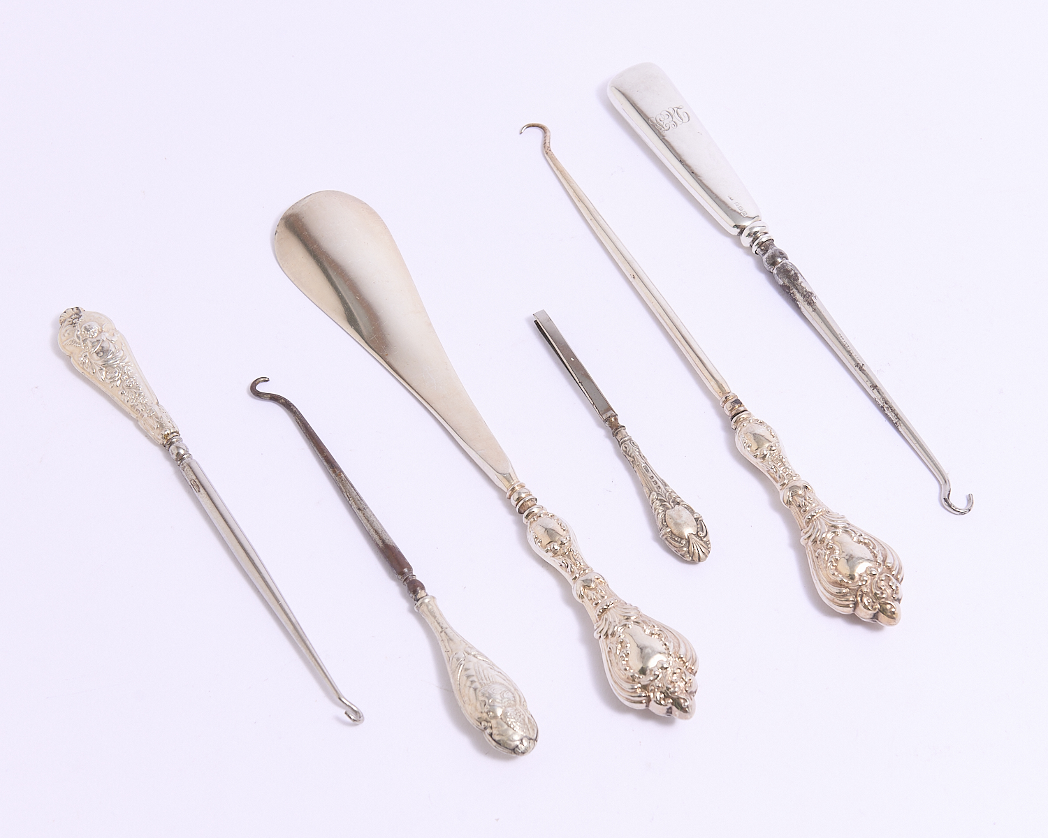 A COLLECTION OF STERLING SILVER HANDLED BUTTON HOOKS AND SHOE HORNS L.25CM (LARGEST), LEONARD JOEL LOCAL DELIVERY: SMALL