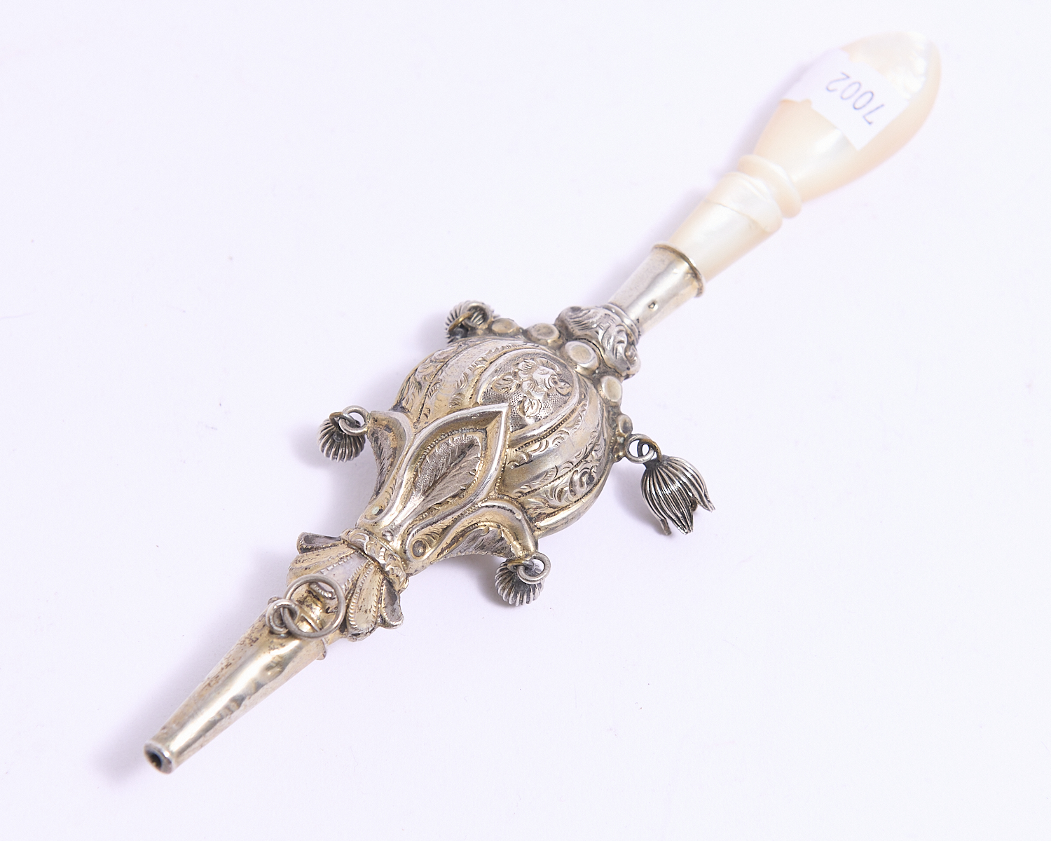 A SILVER BABYS RATTLE AND WHISTLE WITH MOP HANDLE (A/F) L.16.5CM, LEONARD JOEL LOCAL DELIVERY: SMALL