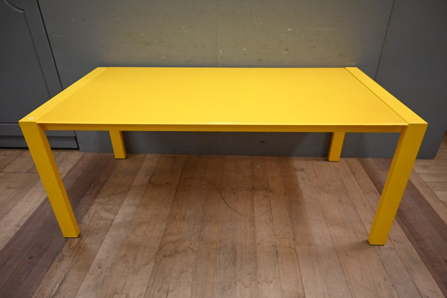 AN AERO POP YELLOW GLASS AND POWDERCOATED METAL TABLE (A/F) (74H X 180W X 91D CM) (PLEASE NOTE THIS HEAVY ITEM MUST BE REMOVED BY CLIENTS OR CARRIERS AT THE CUSTOMERS EXPENSE. LEONARD JOEL STAFF CANNOT ASSIST CARRYING THIS ITEM)