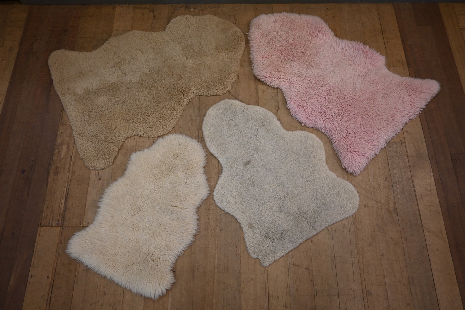 A COLLECTION OF FOUR SHEEP SKIN RUGS (LARGEST 110 X 80 CM) (A/F) (LEONARD JOEL DELIVERY SIZE: SMALL)