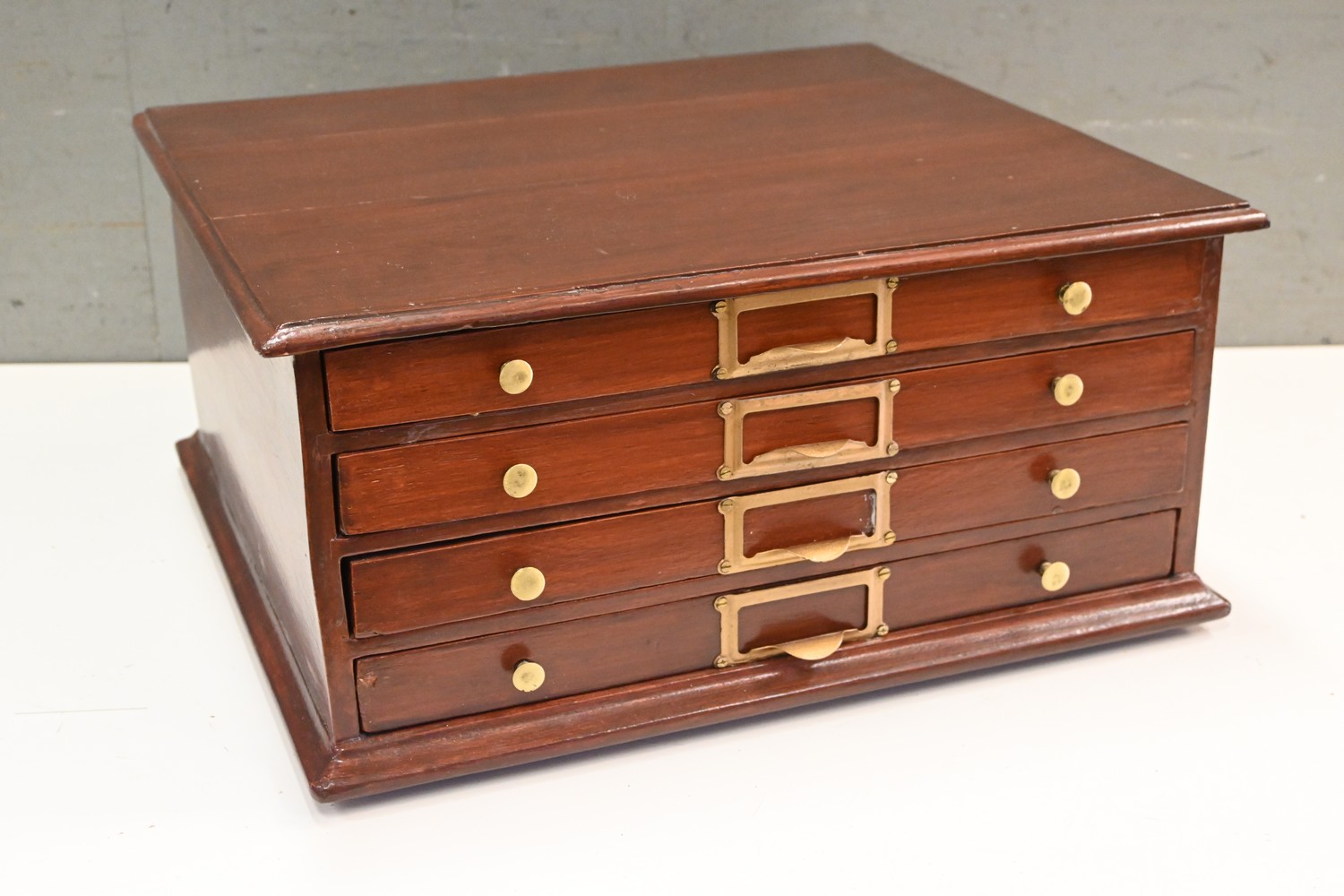 A CIRCA 1900 OAK FOUR DRAWER DESK TOP FILING CABINET (23H X 48W X 44D CM) (LEONARD JOEL DELIVERY SIZE: MEDIUM)