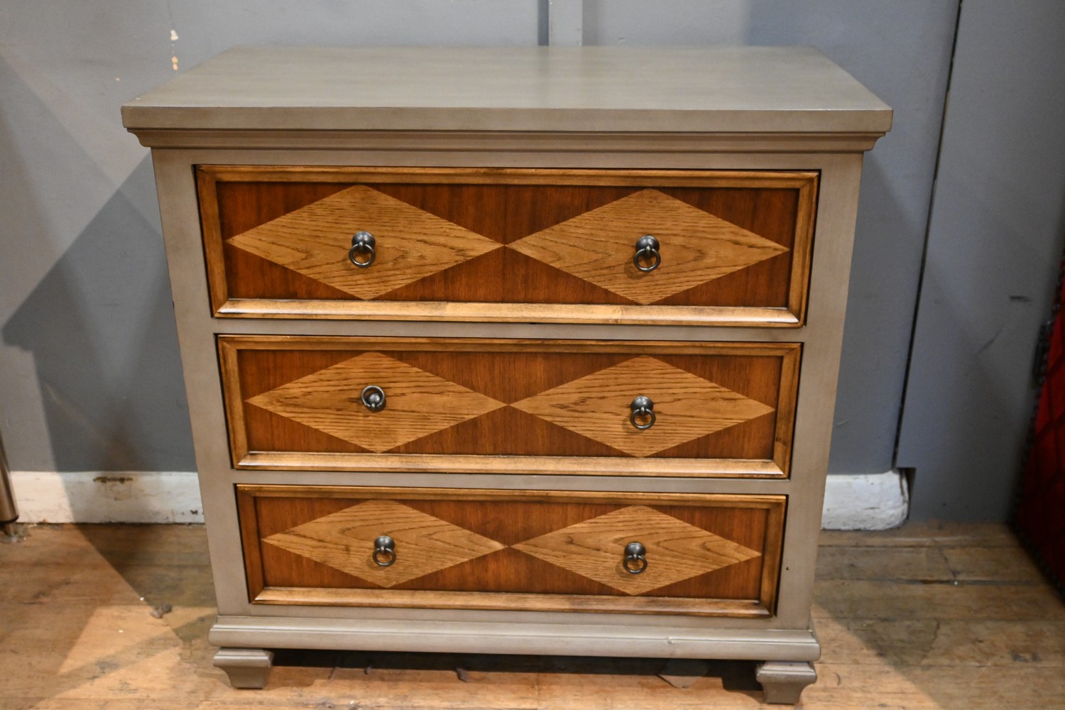 A CONTEMPORARY TIMBER INLAID THREE DRAWER CHEST (85H X 86W X 46D CM) (PLEASE NOTE THIS HEAVY ITEM MUST BE REMOVED BY CLIENTS OR CARRIERS AT THE CUSTOMERS EXPENSE. LEONARD JOEL STAFF CANNOT ASSIST CARRYING THIS ITEM)