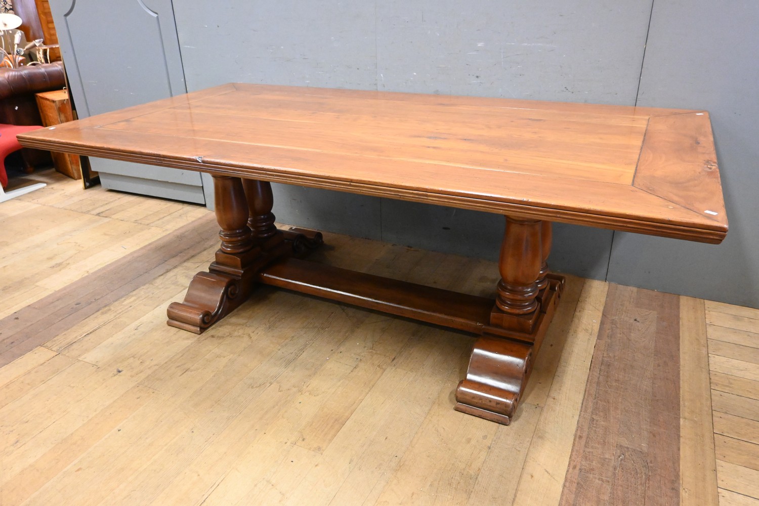 A PROVINCIAL STYLE STRETCHER BASE DINING TABLE (78H X 220W X 119D CM) (PLEASE NOTE THIS HEAVY ITEM MUST BE REMOVED BY CLIENTS OR CARRIERS AT THE CUSTOMERS EXPENSE. LEONARD JOEL STAFF CANNOT ASSIST CARRYING THIS ITEM)